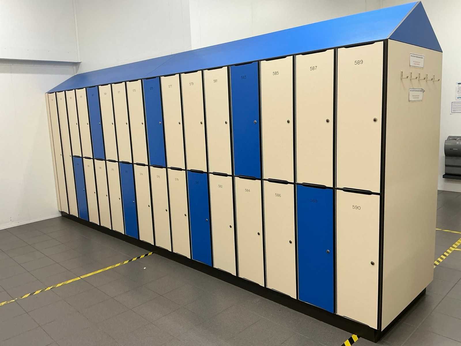 In diverse afmetingen en met verschillende uitvoeringen, totale lockerkast lengte circa 24 meter, inclusief vuilgoed kast