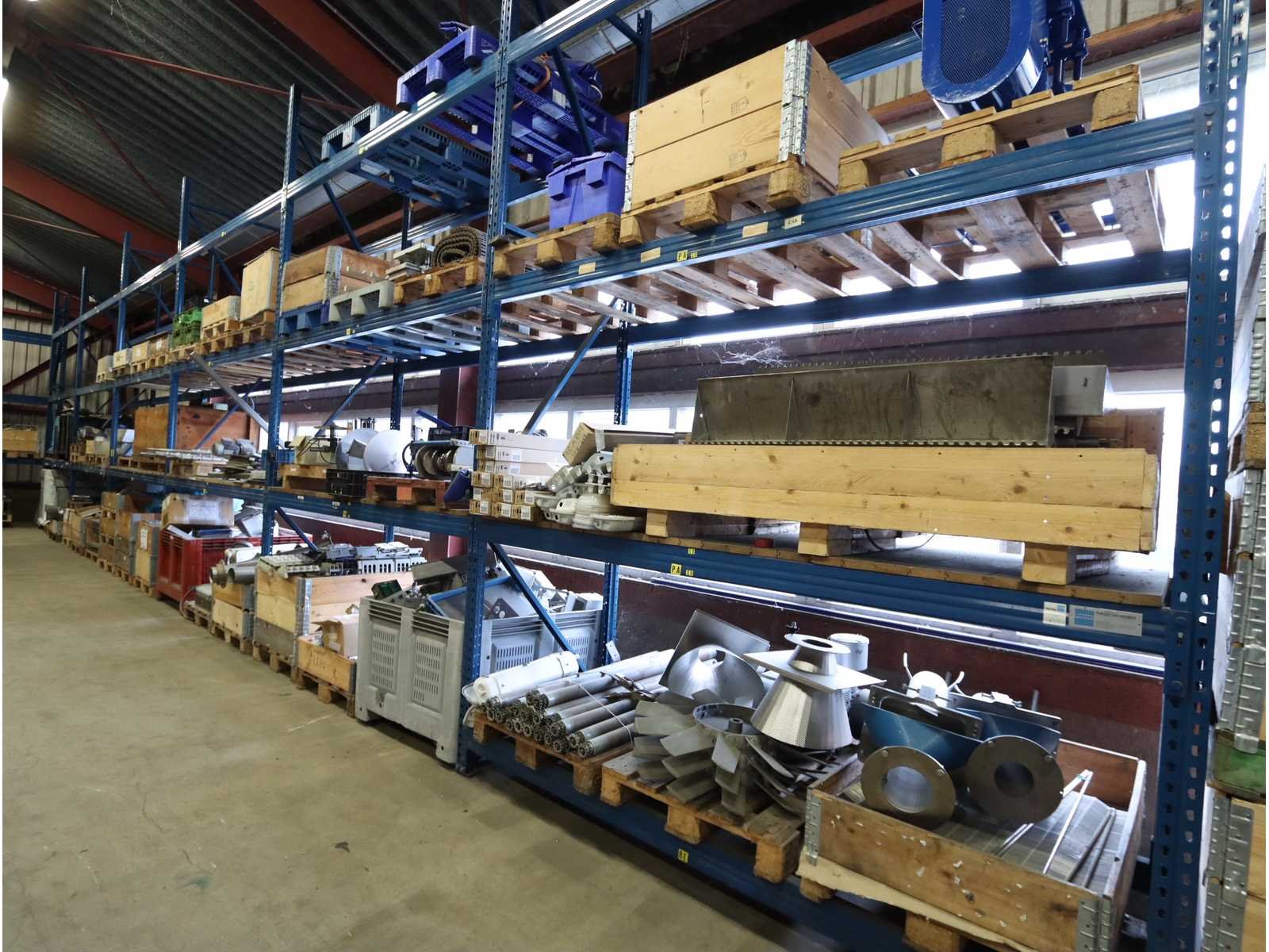 En toebehoren, waaronder transportbanden, kettingtransport, motor, bakken, ventilatoren, trayvormen, installatiemateriaal, etc, uit 10 secties stelling, en op vloer achter hek