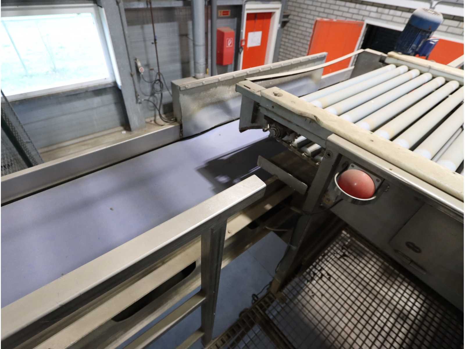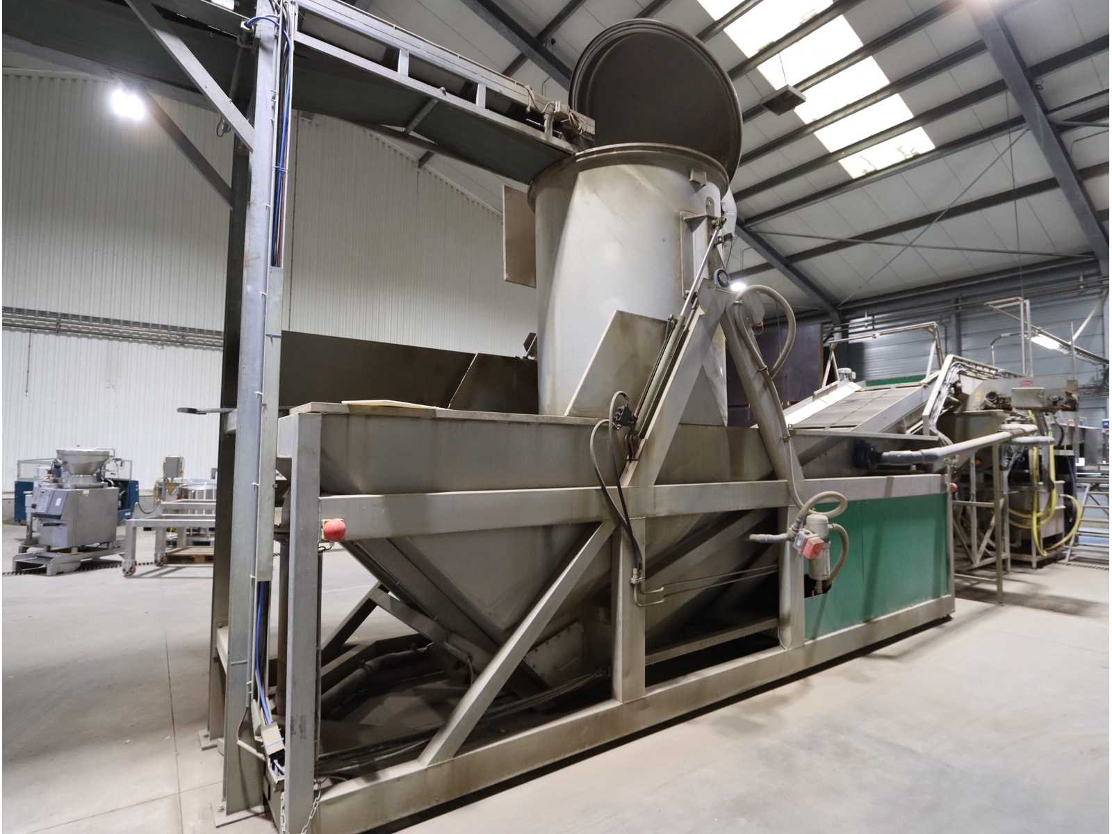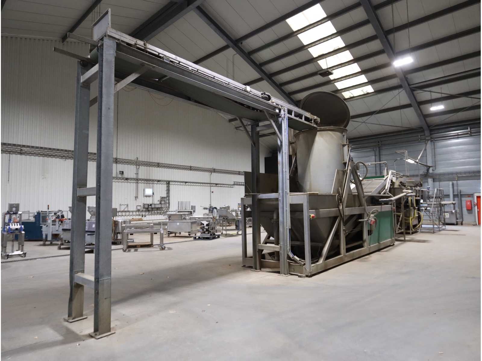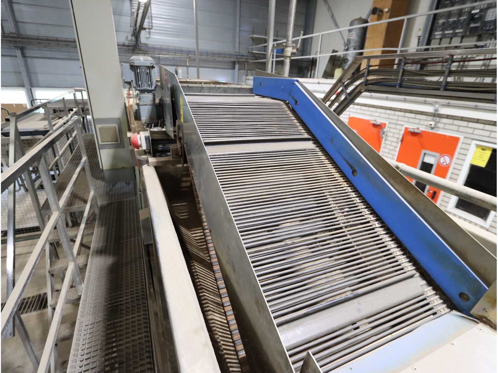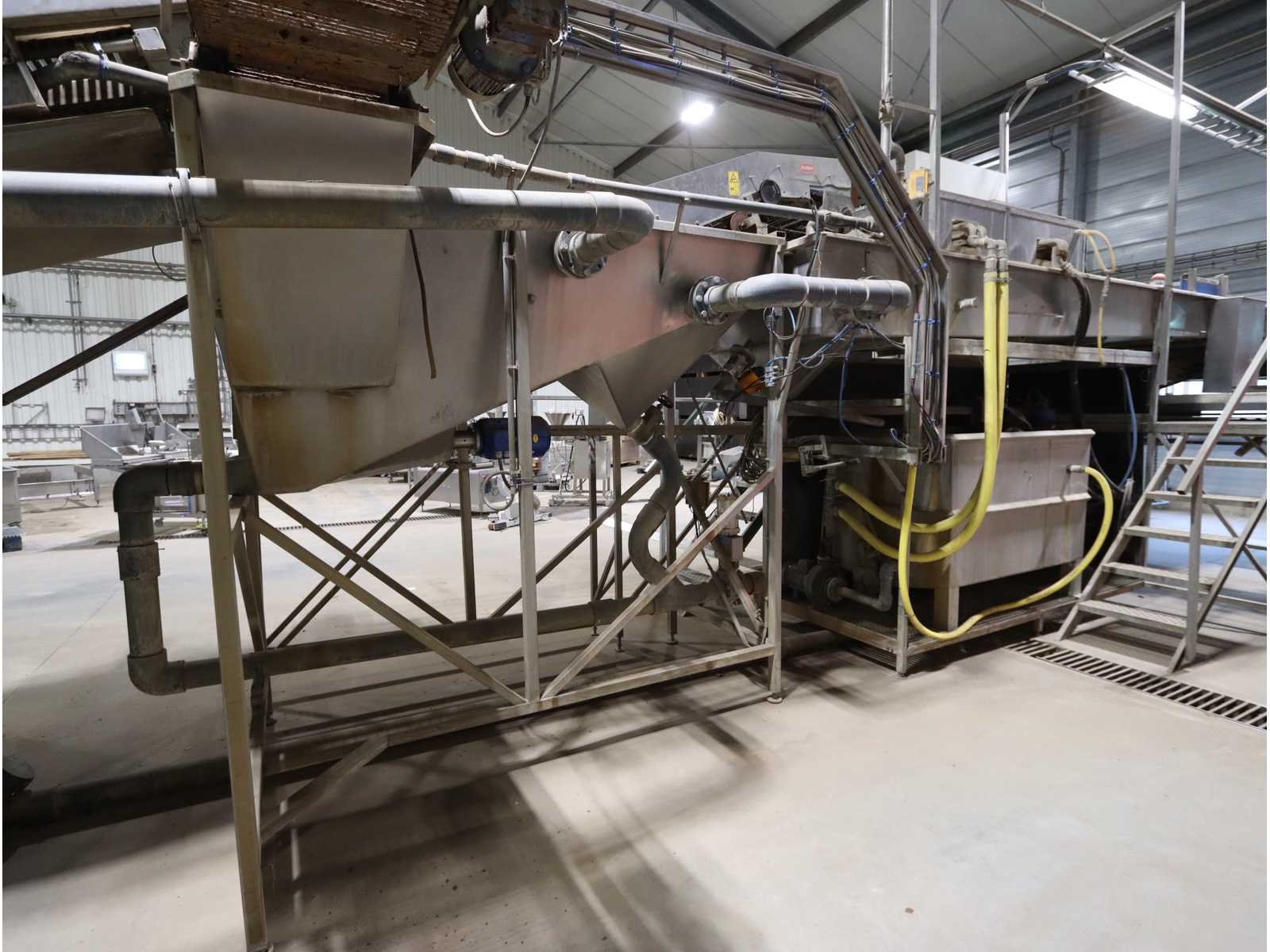 Bestaande uit: RVS kantelbare wasketel met bovenlopende invoer transportband, onderlopende uitvoer transportband, “Botman” schuingestelde zeefband, “Undine” rollentafel met sproei installatie, uitvoer transportbanden, 2-zijdige kistenhouder, 2 deurs schakelkast, bordessen en hekwerk Totale afmeting L: 24000mm Totale afmeting Breedte: 5500mm