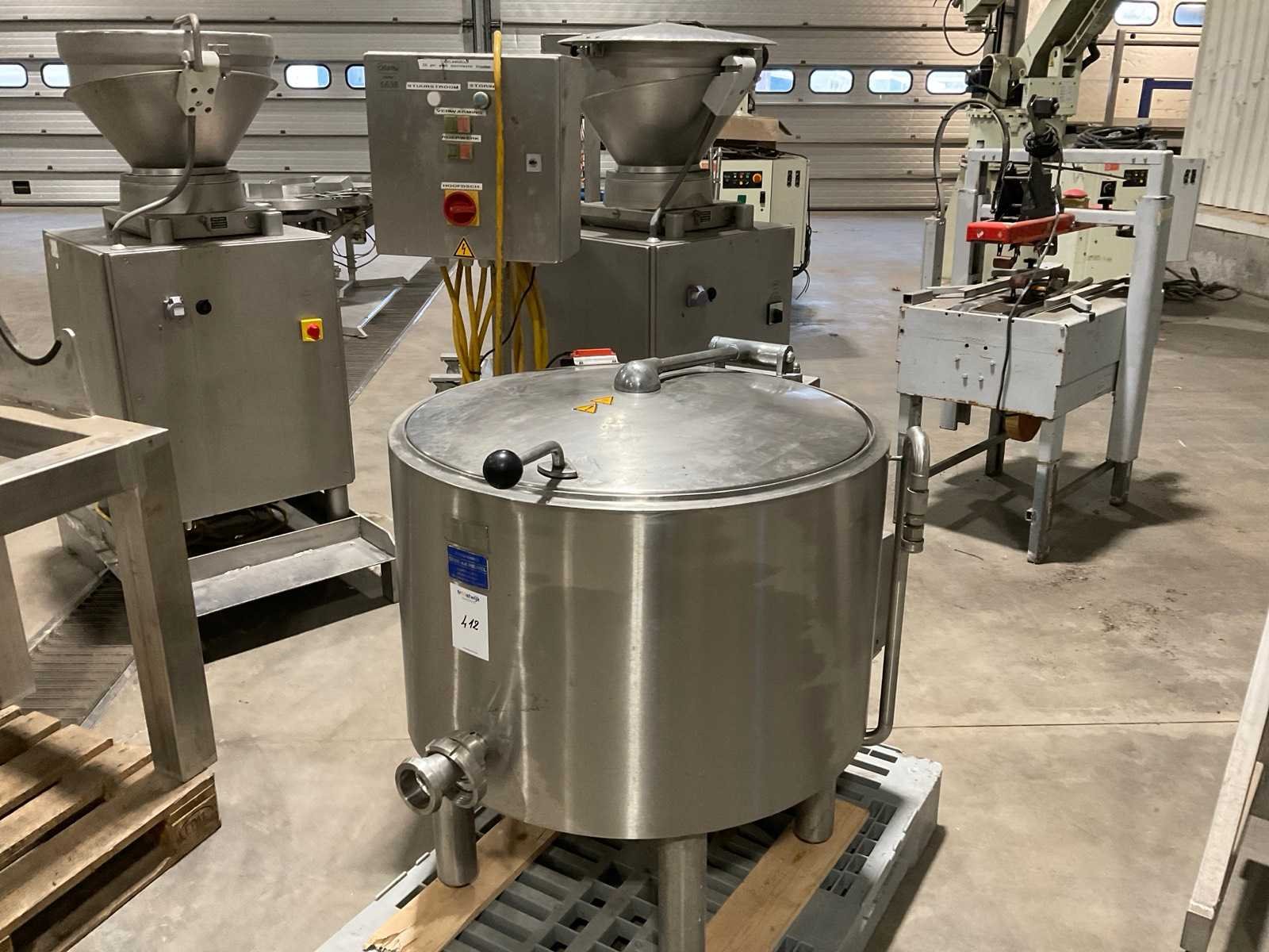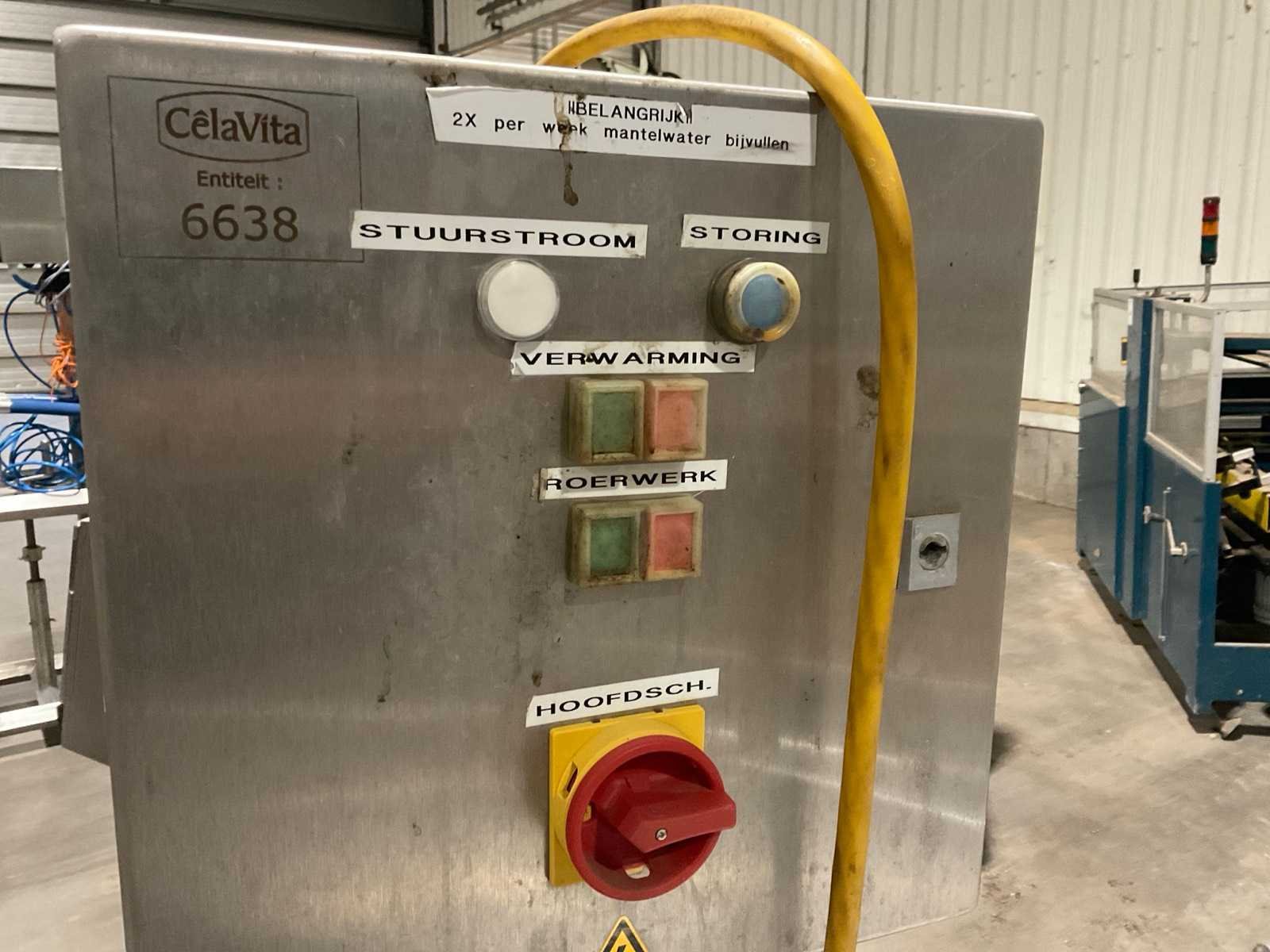 Dubbelwandig, elektrisch verwarmd met roerwerk Merk: v.d.Heuvel Aansluiting: 400V Totale afmeting L: 1000mm Totale afmeting Breedte: 1250mm Totale afmeting Hoogte: 1550mm