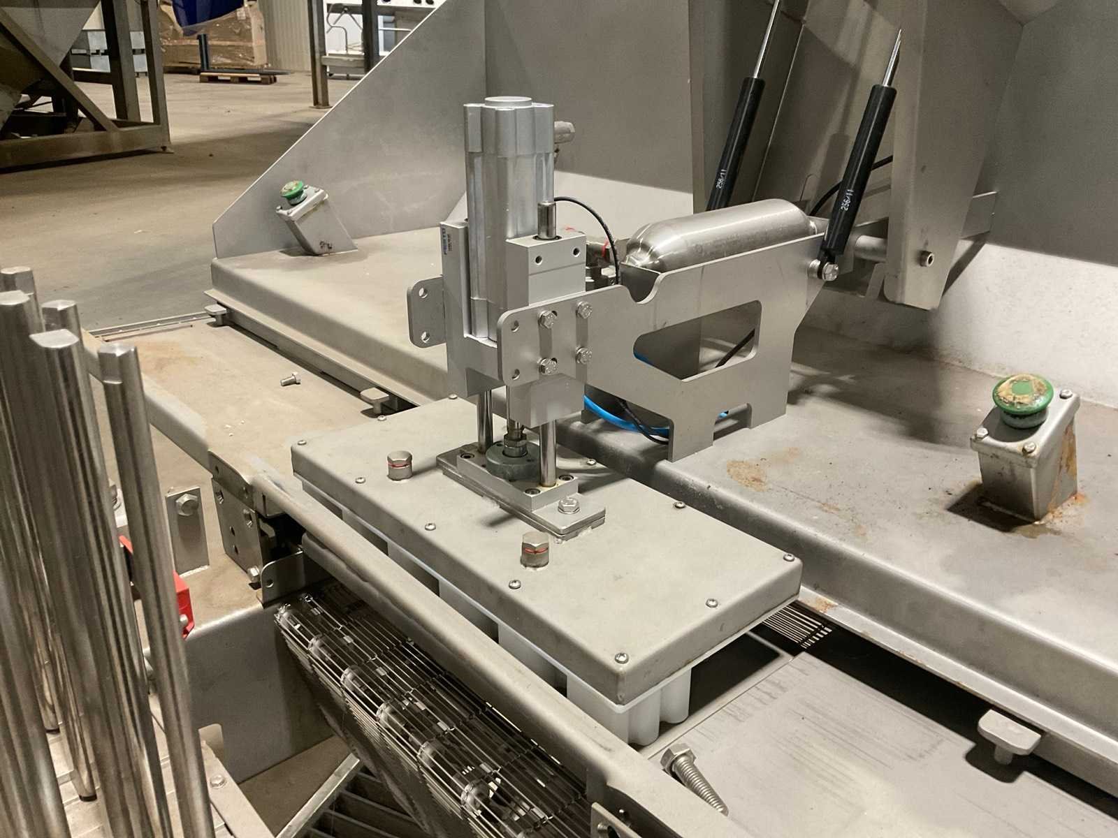 Voorzien van 5-voudige invoer, pneumatisch bediende geleider en onderlopende rvs gaas transportband afmeting circa 400x1000mm Merk: Verbruggen Aansluiting: 230V Totale afmeting L: 1300mm Totale afmeting Breedte: 1700mm Totale afmeting Hoogte: 1500mm