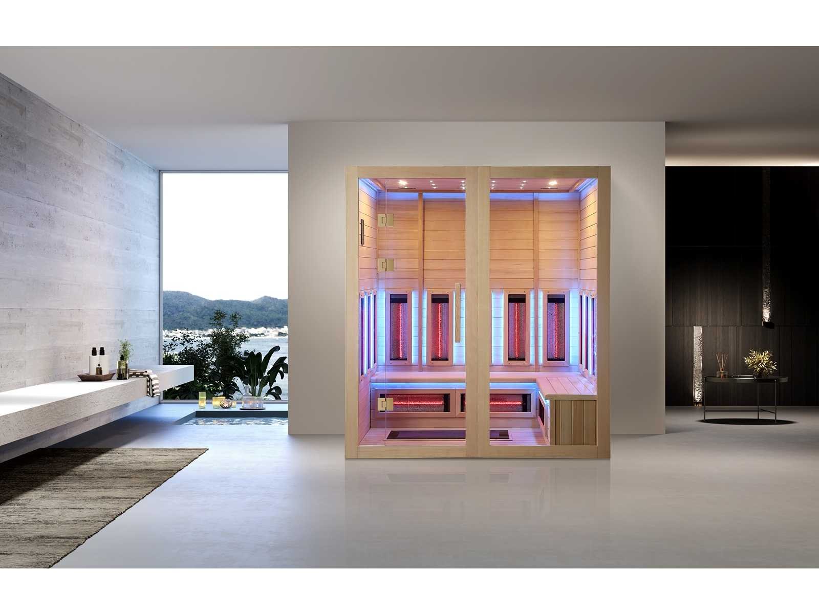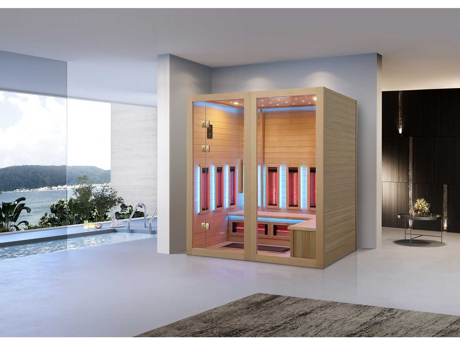 Afmetingen LxBxH 150x200x220cm, voorzien van: 8mm veiligheidsglas, digitaal bedieningspaneel, bluetooth met speakers, totaal 14x infrarood panelen van 3000 watt per stuk, inclusief een natte sauna kachel van 6kw, diverse ledverlichting met kleurentherapie (7 kleuren), Merk: Mawialux Model: keuze Kleur: bruin Gewicht: 200-300kg Lengte: 150cm Breedte: 200cm Hoogte: 220cm Materiaal: Hemlock hout en 8mm veiligheidsglas