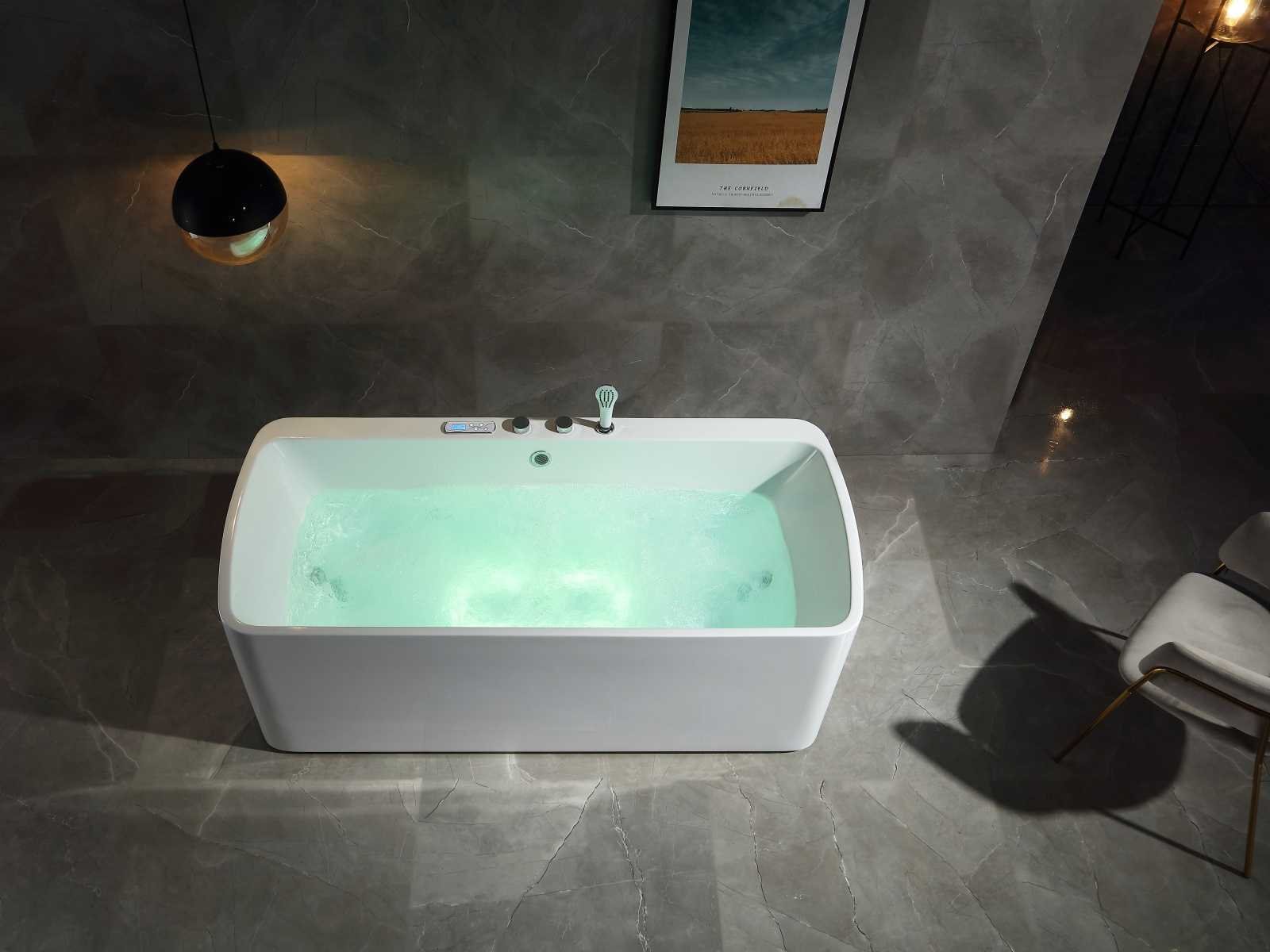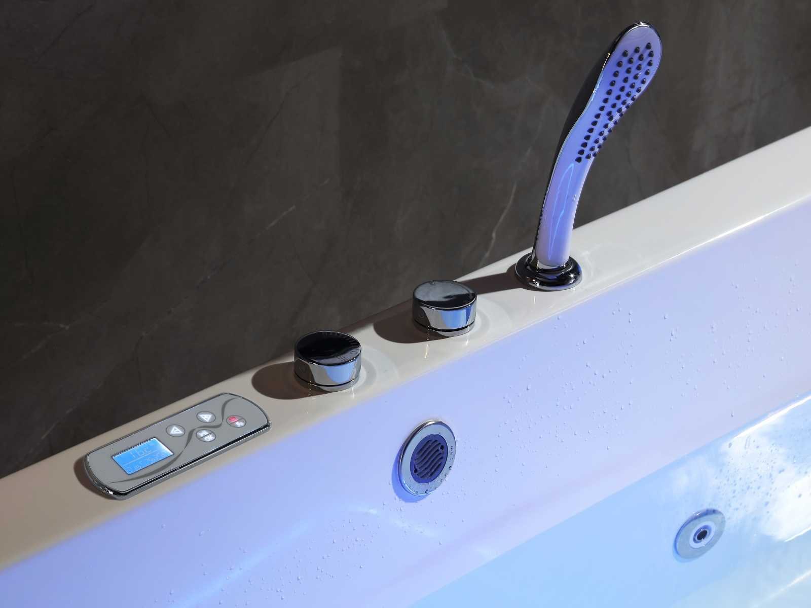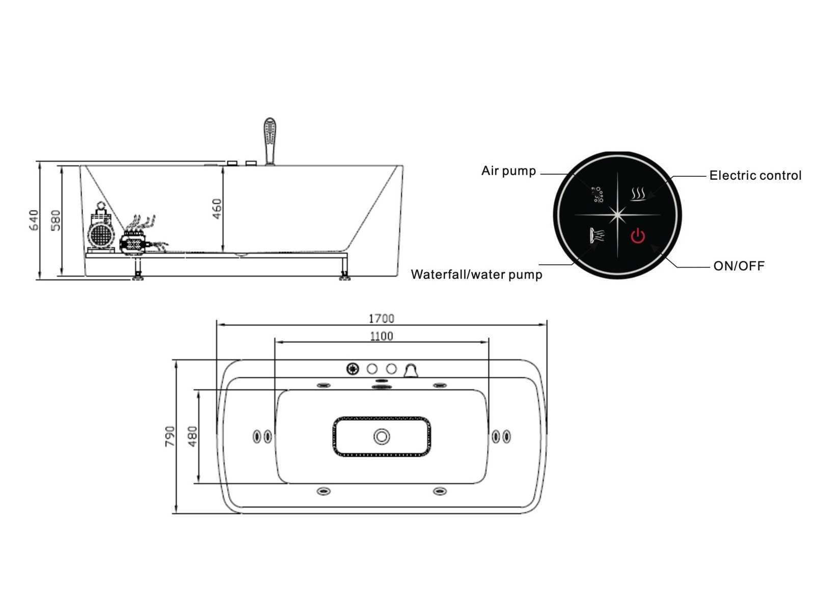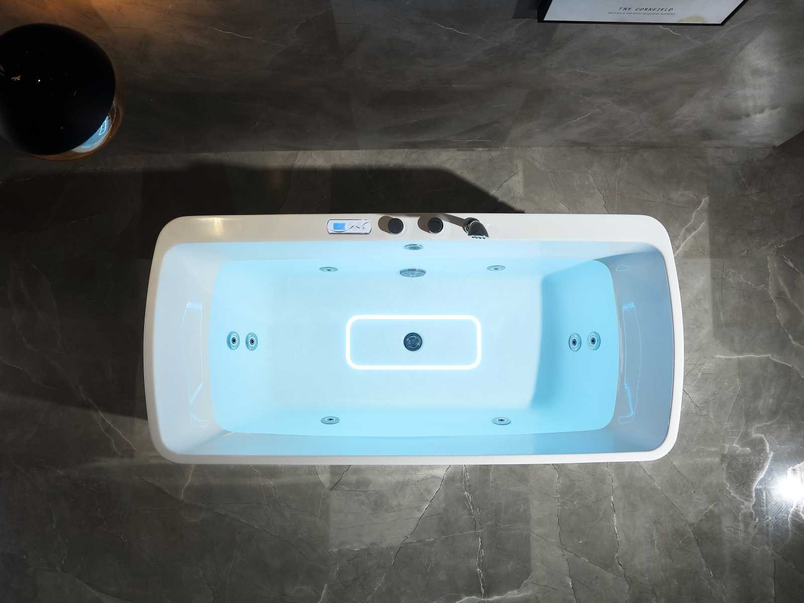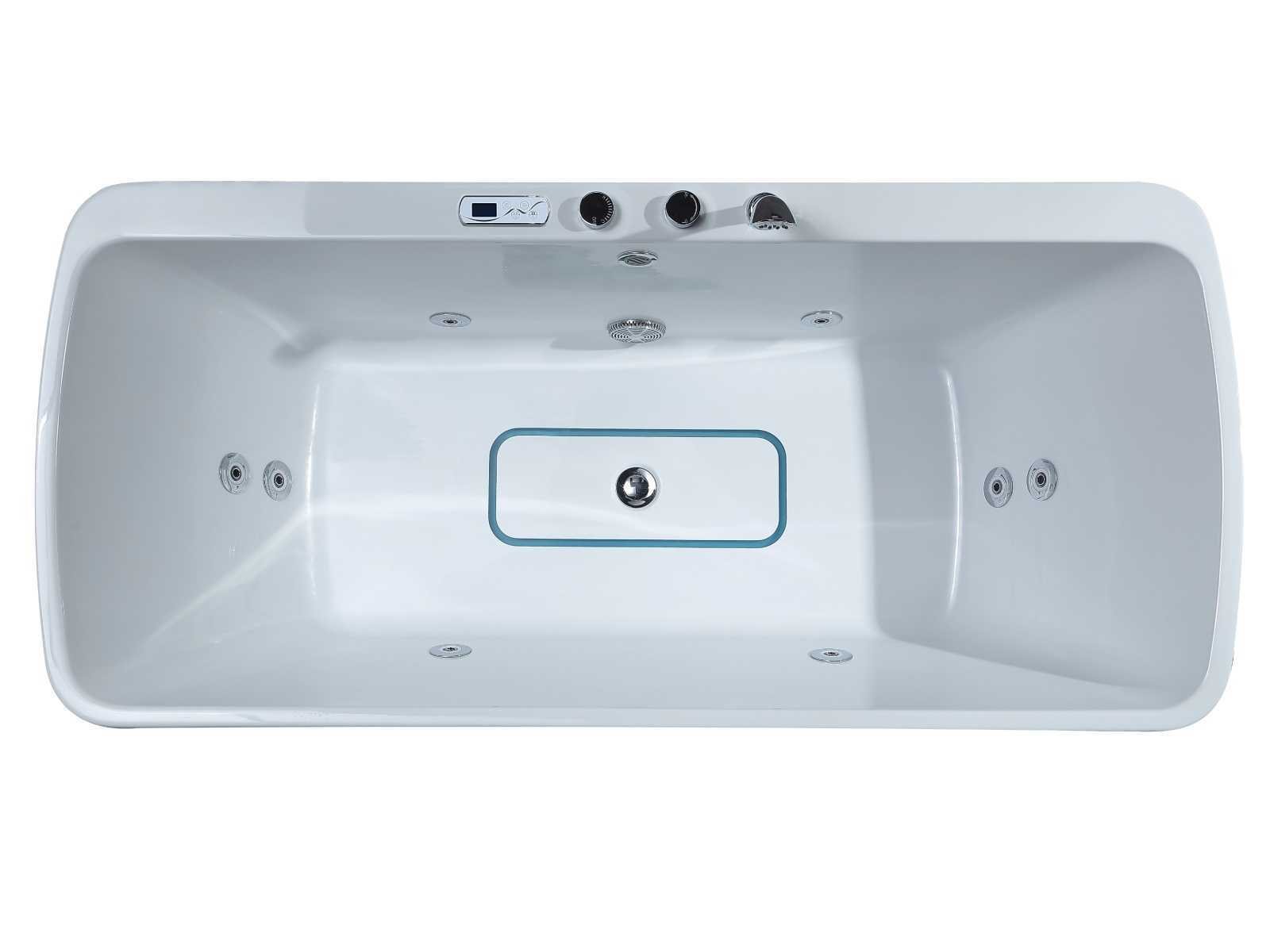 Afvoer pop-up met flexibele waterslang, verwarming 2000 watt, met plug and play 220v stekker, massagepompen 1x 1 pk hydropomp en 1 luchtpomp (sterkte regelbaar), massagejets hydro massagejets en diverse luchtjets, speakers met bluetooth, watertemperatuur regelbaar, digitaal bedieningspaneel, droogloop en waterniveau beveiliging, handdouche met kraanwerk, sterkte van jets regelbaar, chroom kraanwerk van messing, onderstel verstelbaar en van rvs Merk: Mawialux Model: Blanco Kleur: glans wit Gewicht: 75kg Lengte: 170cm Breedte: 79cm Hoogte: 64cm Materiaal: 7 mm acryl verstevigd met polyester en messing kraanwerk