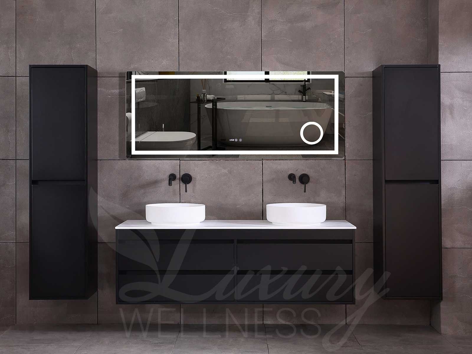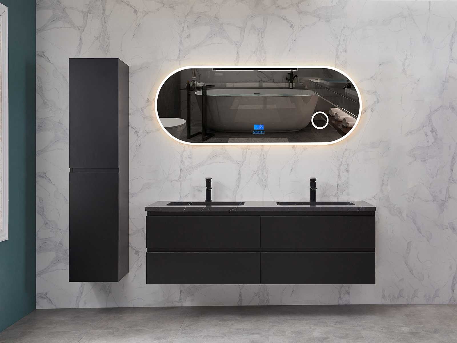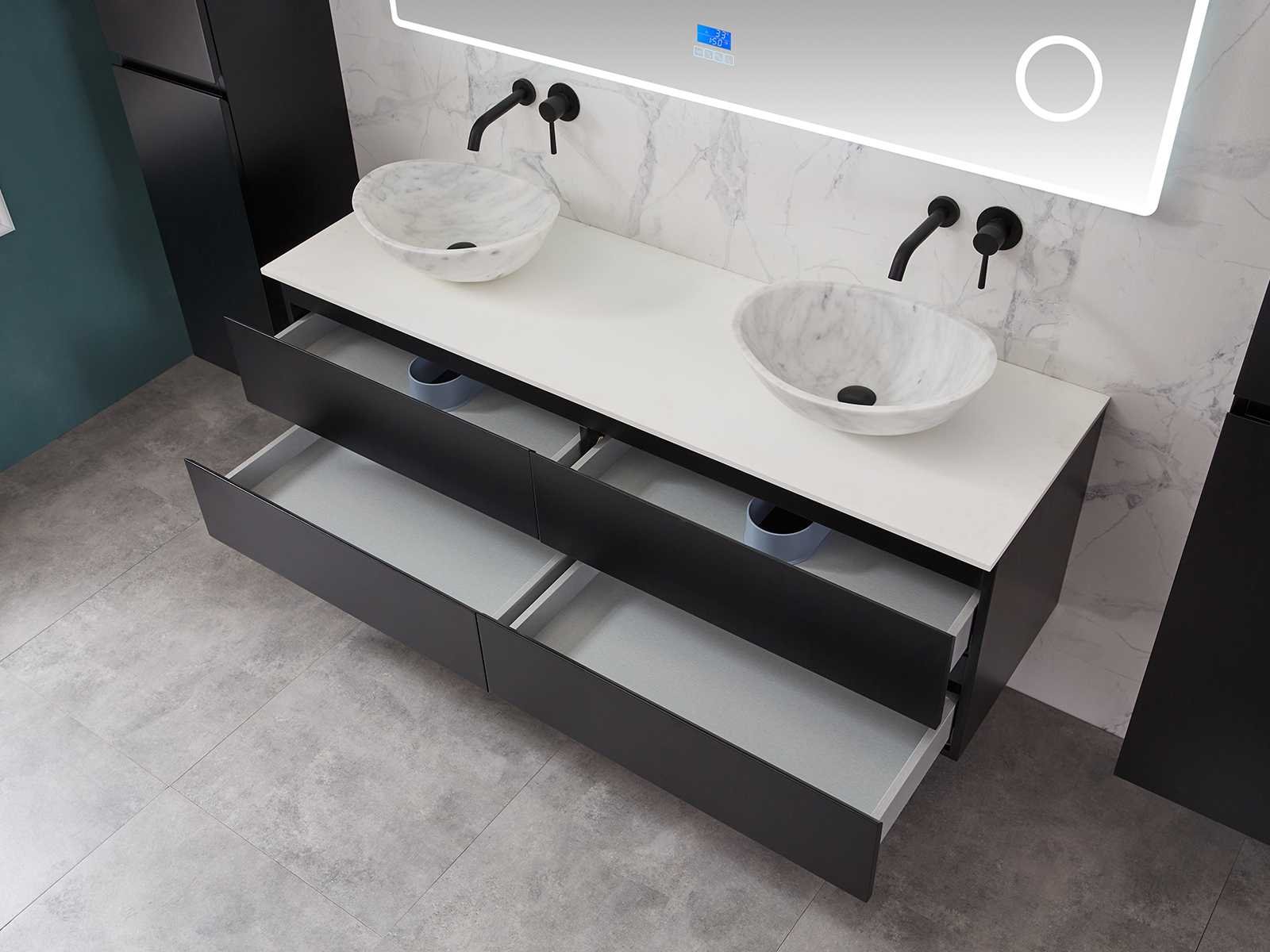 Afmeting meubel bxdxh 160x49x50cm - hangkast 35x35x160cm (1 hangkast zit bij de aankoop), kleur mat zwart, materiaal 2cm 5-laags multiplex(zeer sterk en vochtbestendig),met solid surface topplaat indien gewenst(mat wit of mat zwart), Hangkast softclose deuren en extra planchets (hangkast is universeel en kan zowel links als rechts naast het meubel gehangen worden), kranen exclusief , Lades 4 stuks met softclose, Wasbakken solid surface, natuursteen(met en zonder kraangaten beschikbaar de vaste wastafels) of italiaans marmer (keuze uit diverse modellen en kleuren van de laatste foto's graag doorgeven op afhaaldag), led spiegel met verwarming/radio/klok en vergrootglas met ledverlichting rondom aan de voorkant met 3 verstelbare kleuren led 3000/4500/6000k led-dioden (geel/blauw/wit licht) met de volgende opties digitaal display, geïntegreerde vergrotingsspiegel van 10cm doorsnede met ledverlichting(vergroot 3x), digitale klok, digitale temperatuur aanduiding, 220volt stekker(plug and play), afvoeren exclusief, Conditie: Nieuw in doos, Bijzonderheden 2 jaar garantie, gaten zijn niet in het topblad voorgeboord in u voor deze keuze gaat zodat u zowel muurkranen als kranen vanaf het blad kunt gebruiken of zelf 1 wastafel in plaats van 2 stuks(gaten boren is geen enkel probleem en zeer gemakkelijk uit te voeren bij solid surface) compleet met installatiekit, natuursteen wastafels zijn behandeld met coating, zeer hoge kwaliteit, let op! de hangkast mag geruild worden voor een set kranen en popup afvoeren naar keus of als u een extra hangkast nodig graag op de afhaaldag aangeven voor een passende aanbieding Merk: Mawialux Model: Brandon Hoogte: 50cm Lengte: 49cm Breedte: 160cm Materiaal: 2cm massief top en 5-laags multiplex(zeer sterk en vochtbestendig) Kleur: Mat zwart Kraan: exclusief Wastafel: diverse keuzes Waskom: diverse keuzes Spiegel met verlichting: ja Verlichting: ja Lades: 4 Softclose: true Bevestigingsmateriaal: true Zijkast: ja 1x