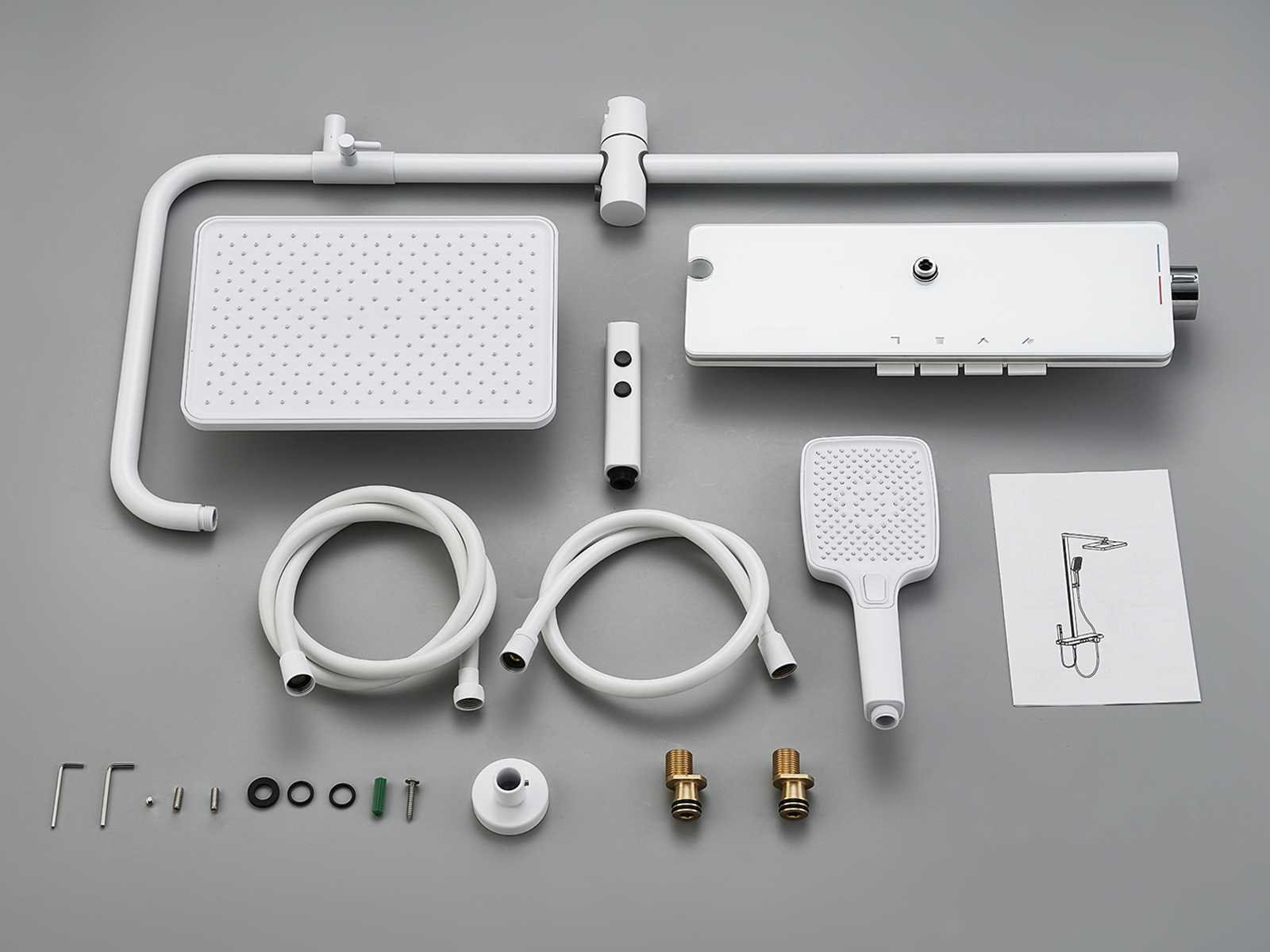 De doucheset is uitgerust met vier functies. Hoofddouche, 2x losse handdouche en badkraan uitloop. Door de aanwezigheid van de baduitloop is deze doucheset uitermate geschikt voor douchebaden. Naast deze vier functies is de doucheset uitgerust met een digitaal display waarop je in een oogopslag de temperatuur van het water kunt aflezen. Daarnaast word er gebruik gemaakt van keramische binnenwerken zodat je jarenlang plezier zult hebben van jouw regendoucheset. Doordat de doucheset in hoogte verstelbaar is past hij in vrijwel elke badkamer! Hoogte verstelbaar 80 - 120 cm. Materiaal: RVS / messing. Kleur: gunmetal grey Kraan: mengkraan. Binnenwerk: keramisch. Douchekop: 30x20 cm kantel/draaibaar. Handdouche: verstelbaar met doucheslang en 2 functies. Voorzien van: digitale micromotor aansturing door middel van waterflow. Geen stroom nodig. Temperatuur digitaal afleesbaar. Tijdsduur digitaal afleesbaar. Keramisch binnenwerk. Badkraan uitloop (waterval). Bijzonderheden: waterfuncties worden bediend door druktoetsen (meerdere functies hierdoor tegelijk mogelijk), h.o.h. afstand van 150 mm. Merk: Mawialux Model: Julian Kleur: mat wit