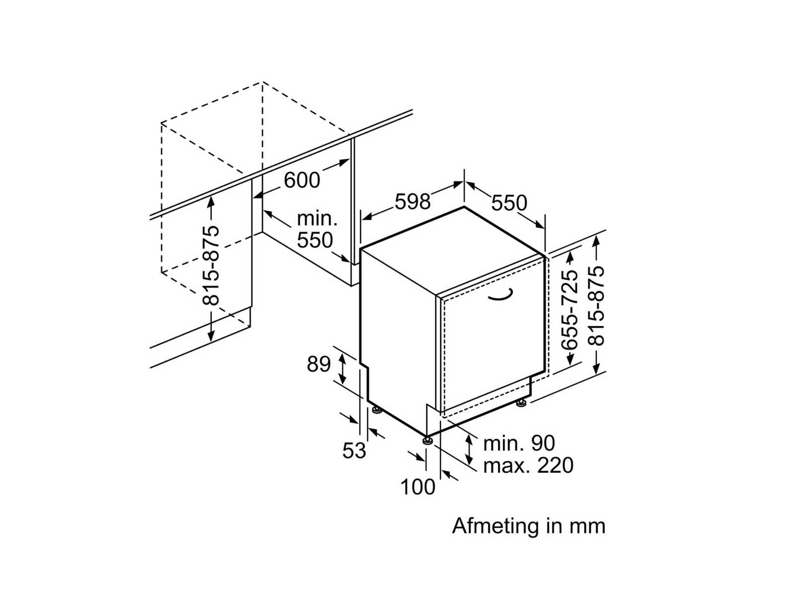 Minimale Nishoogte; 815 mm Maximale Nishoogte; 875 mm Minimale Nisbreedte; 600 mm Maximale Nisbreedte; 608 mm Nisdiepte; 550 mm 1 maand garantie Merk: Bosch Model: SMV90M30NL Volume: 46dB Spanning: 230V Energielabel: A++ Gewicht: 34.5kg Lengte: 55cm Breedte: 59.8cm Hoogte: 81.5cm Aantal couverts: 13