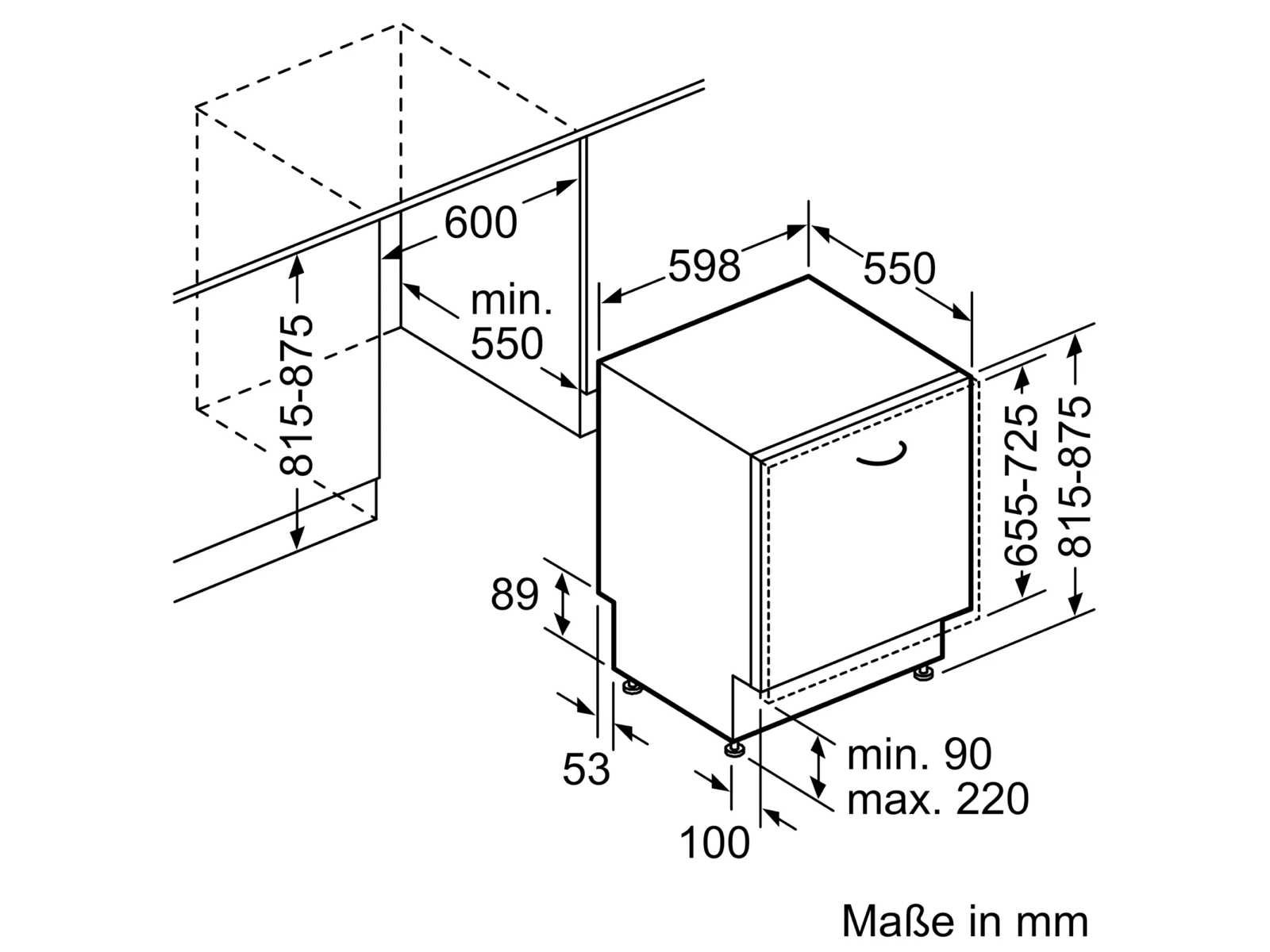 Minimale Nishoogte; 815 mm Maximale Nishoogte; 875 mm Minimale Nisbreedte; 600 mm Maximale Nisbreedte; 608 mm Nisdiepte; 550 mm 1 maand garantie Merk: Bosch Model: SMV45IX05E Volume: 44dB Spanning: 240V Energielabel: D Gewicht: 44kg Lengte: 55cm Breedte: 59.8cm Hoogte: 81.5cm Aantal couverts: 13