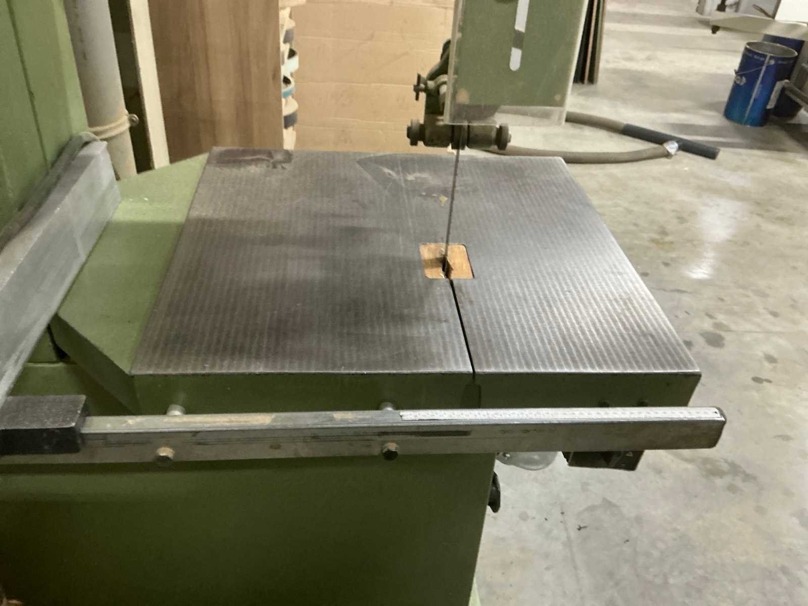 Maximale zaaghoogte 385 mm; vermogen 1,5 kW Merk: Framar Bouwjaar: 1979 Serienummer: 404 Uitlading: 510mm Tafel afmeting l: 690mm Tafel afmeting b: 650mm Aansluiting: 400V Afmeting l: 105mm Afmeting b: 850mm Afmeting h: 2200mm