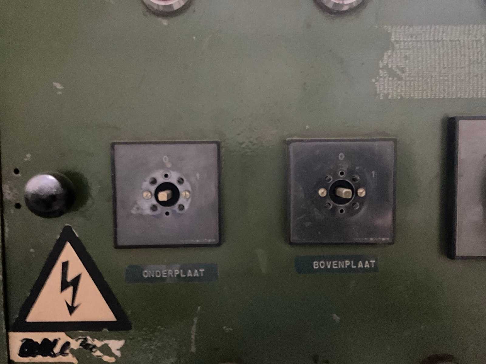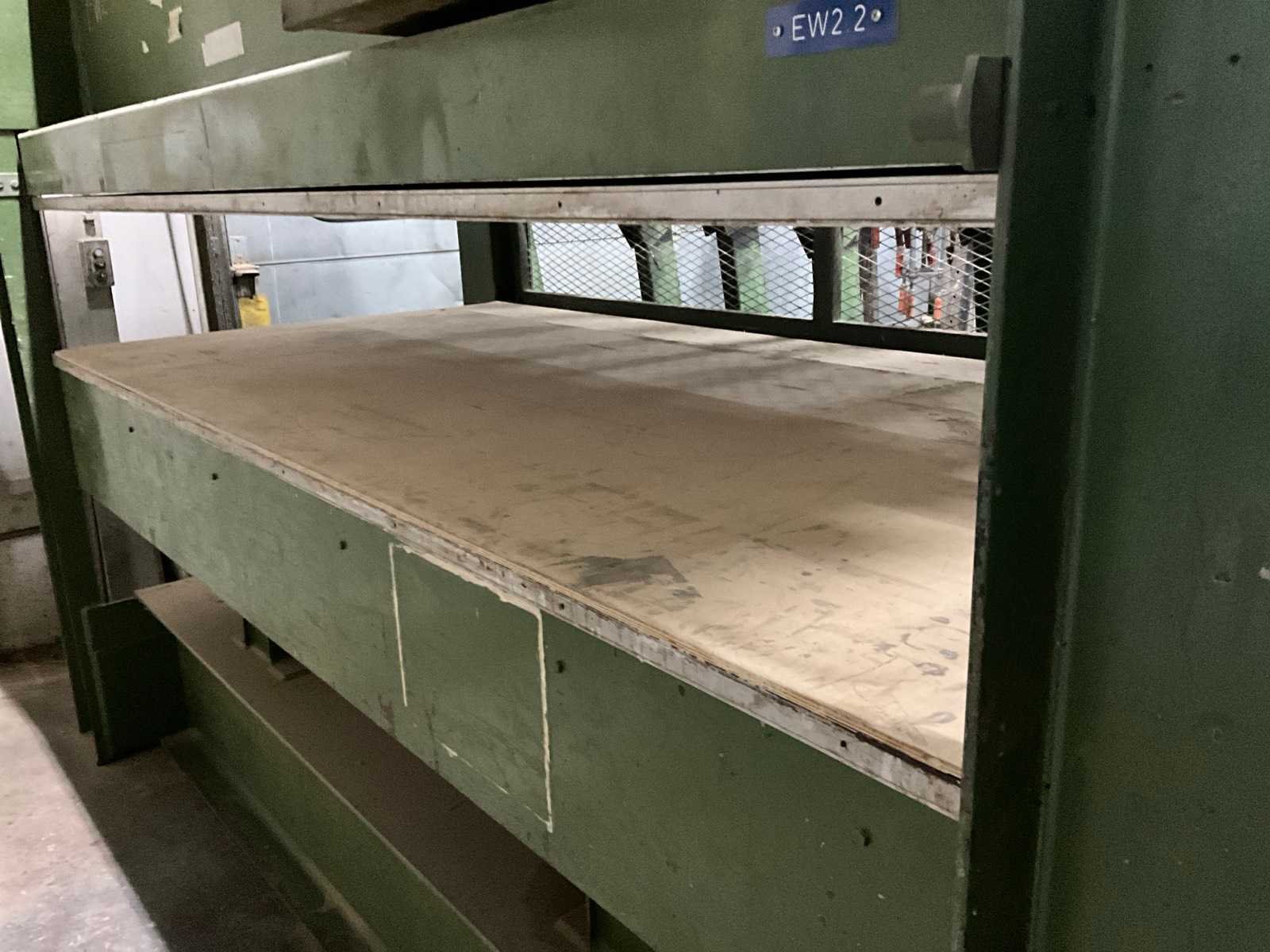 Verwarmde boven en onder plaat ( geen kabels) Merk: Stevens Type: EW2.2 Max. formaat l: 2555mm Max. formaat b: 1250mm Aantal cilinders: 4 Aansluiting: 400V Afmeting l: 2800mm Afmeting b: 1500mm Afmeting h: 2100mm