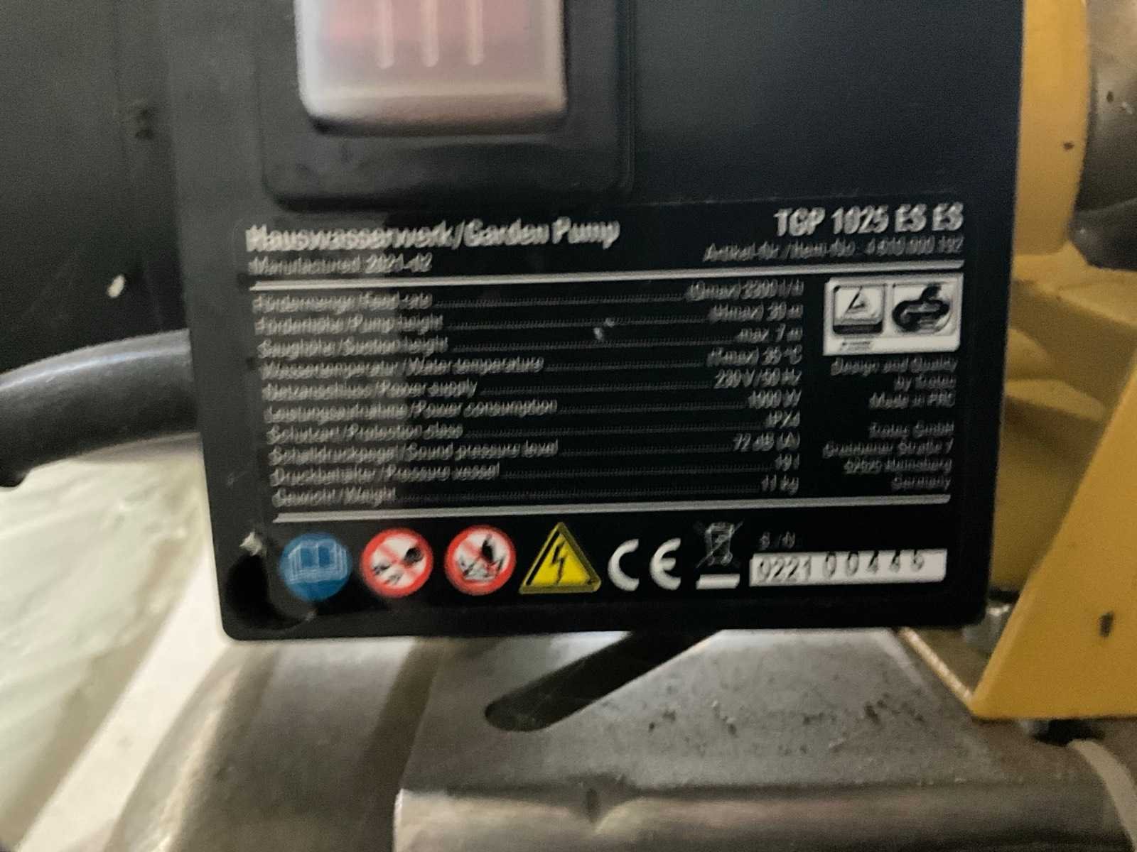 Type: TGP1025ESES Serienummer: 022100446 Vermogen: 1kW Capaciteit.: 3300l/hr H-max.: 30m Aansluiting: 230V Eigen gewicht: 11kg