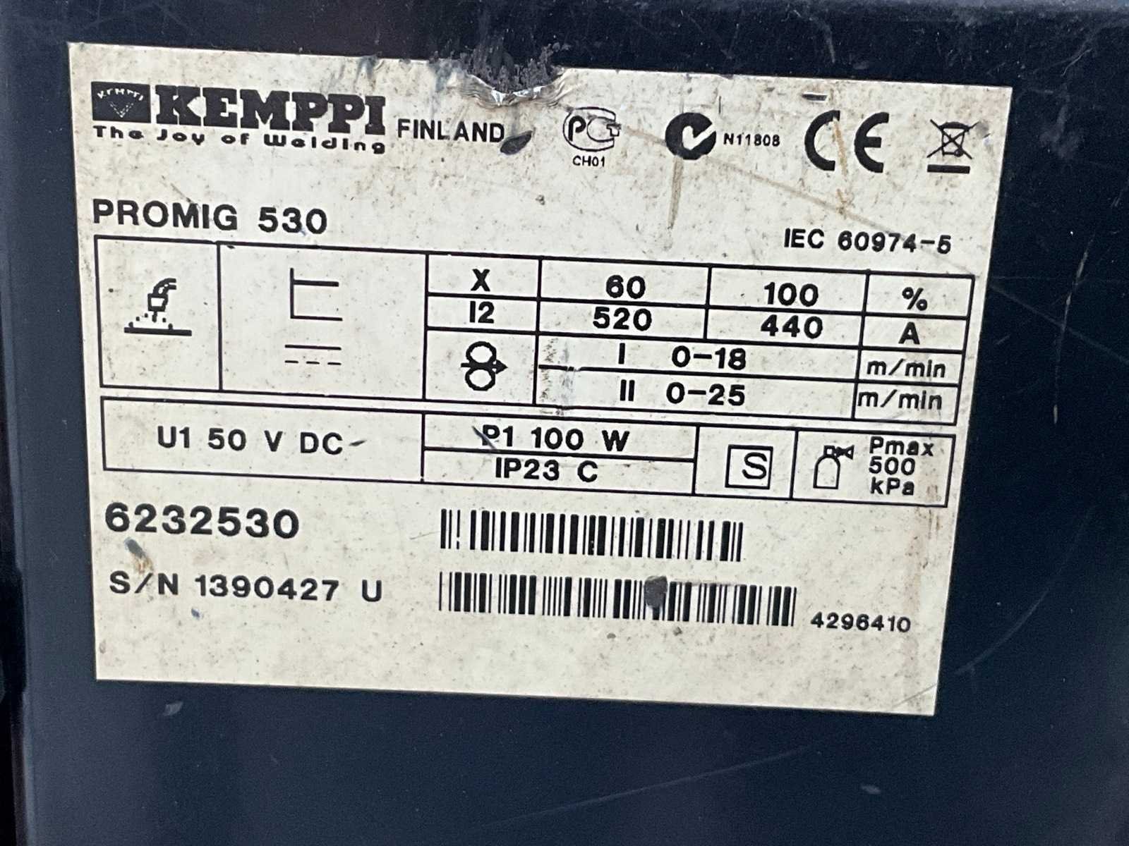Voorzien van promig 530 draadaanvoer unit, pro cool 30 koeler Merk: Kemppi Type: Pro 4200 evolution Max. lasvermogen: 420A Afmeting l: 900mm Afmeting b: 400mm Afmeting h: 1300mm