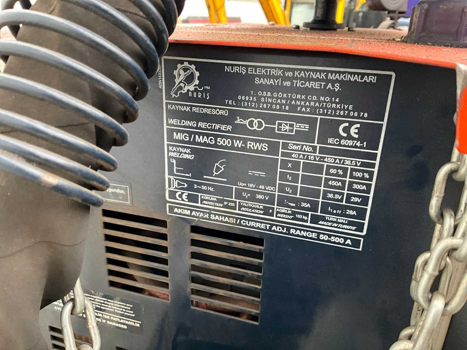 Merk: Nuris Type: MIG/MAG 500 W Max. lasvermogen: 450A Aansluiting: 380V Draadaanvoerunit: true Afmeting l: 900mm Afmeting b: 500mm Afmeting h: 1500mm