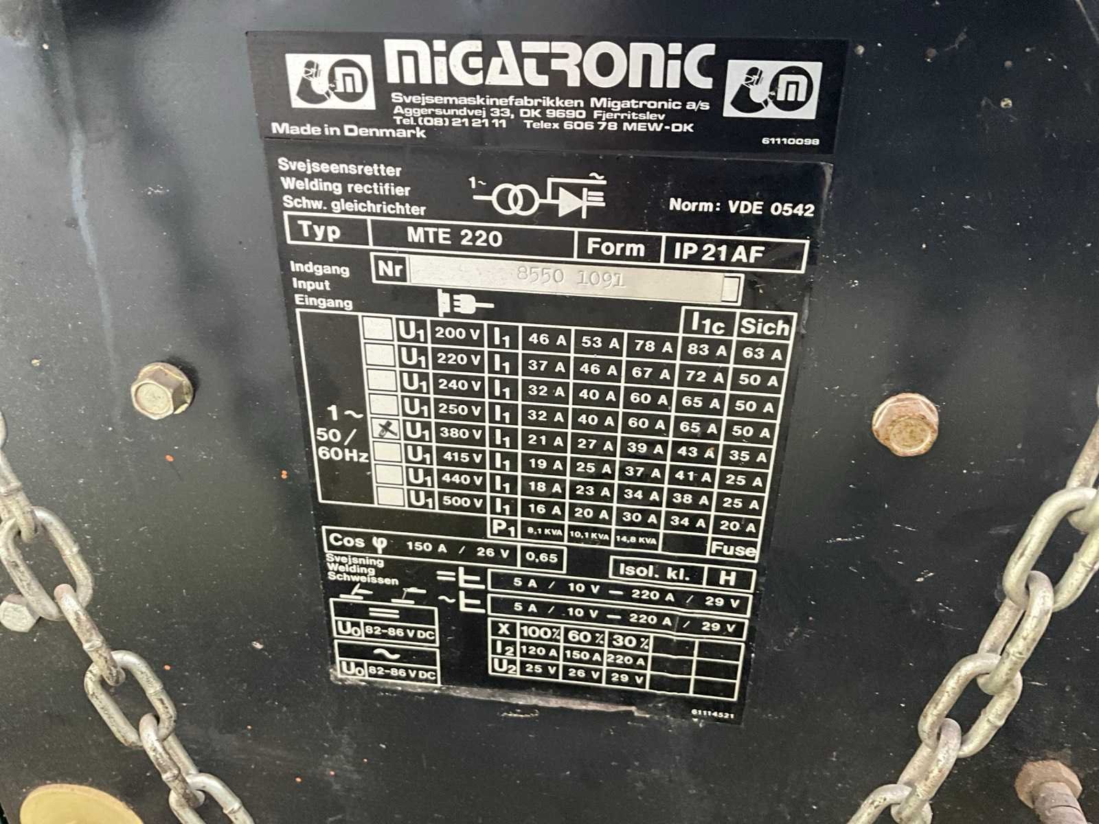 Merk: Migatronic Type: MTE 220 Max. lasvermogen: 220A Aansluiting: 380V Afmeting l: 1200mm Afmeting b: 700mm Afmeting h: 900mm