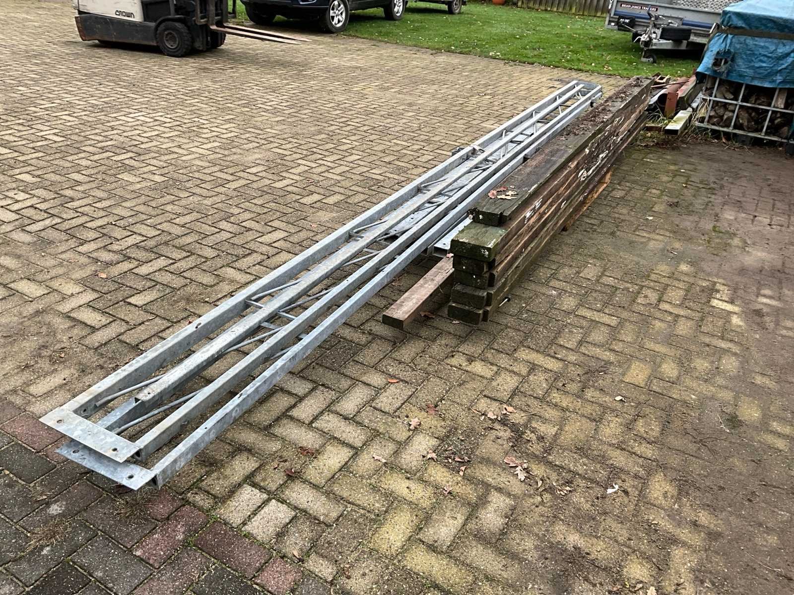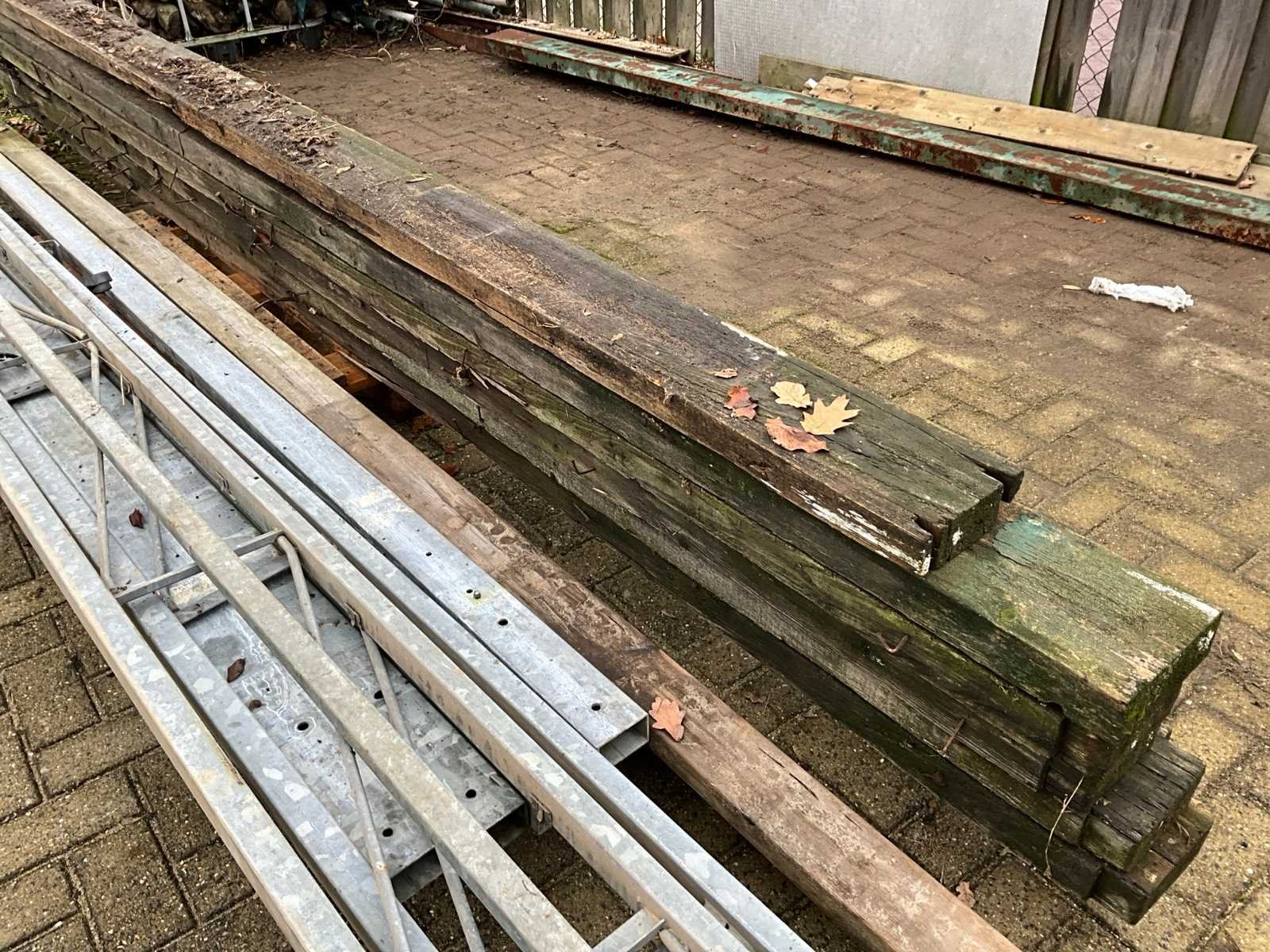 Betreft staalconstructie met houten dwarsbalken, Reeds gedemonteerd, zonder dakplaten, Lengte: 390cm Breedte: 650cm Hoogte: 300cm