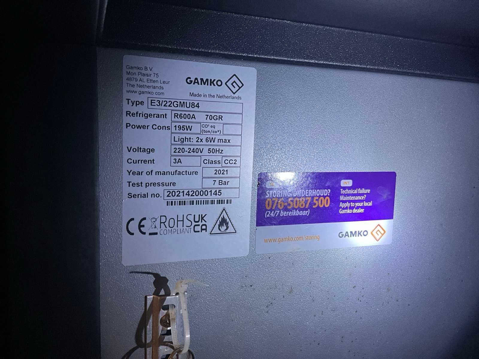 Koelmiddel R600A Merk: Gamco Type: E3/22GMU84 Serienummer: 202142000145 Klapdeur(en): 2 Regelbare thermostaat: true Bouwjaar: 2021 Digitale uitlezing: true Aansluiting: 220V Totale afmeting L: 530mm Totale afmeting Breedte: 1440mm Totale afmeting Hoogte: 880mm