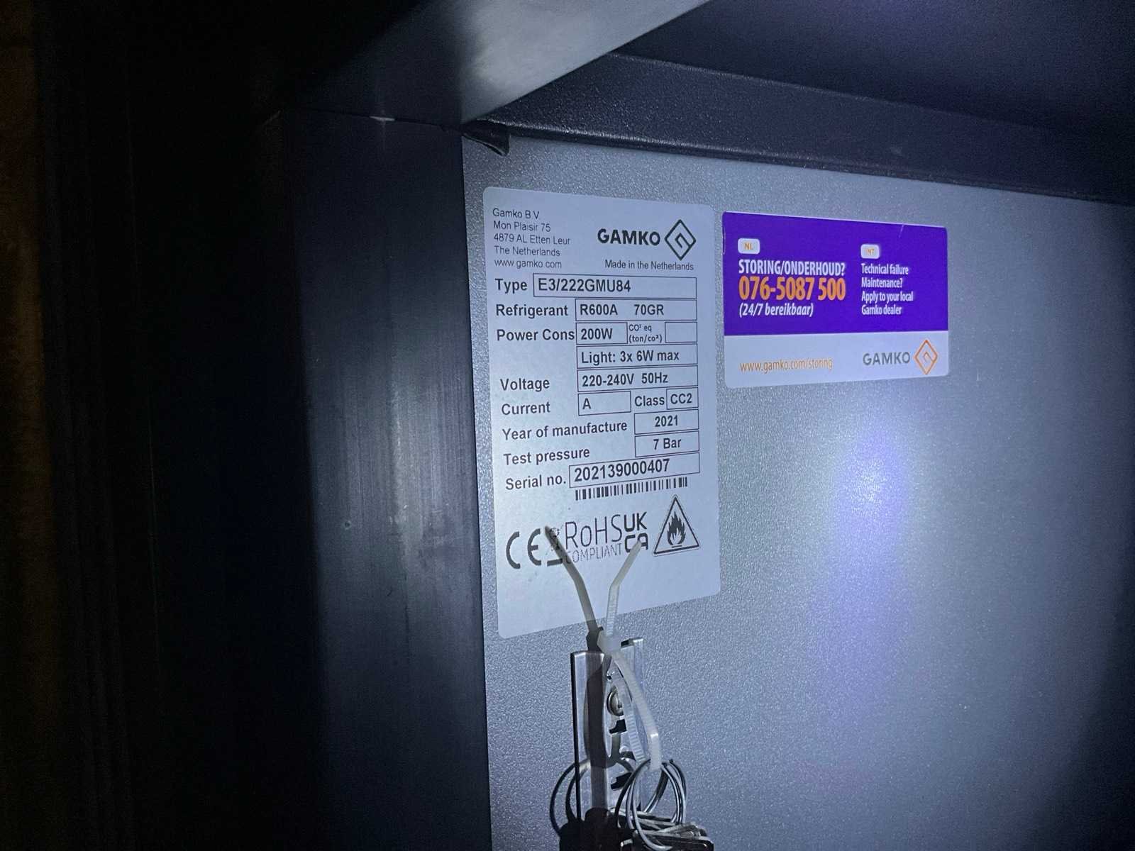 Koelmiddel R600A Merk: Gamco Type: E3/222GMU84 Serienummer: 202139000407 Klapdeur(en): 3 Regelbare thermostaat: true Bouwjaar: 2021 Digitale uitlezing: true Aansluiting: 220V Totale afmeting L: 530mm Totale afmeting Breedte: 1990mm Totale afmeting Hoogte: 860mm