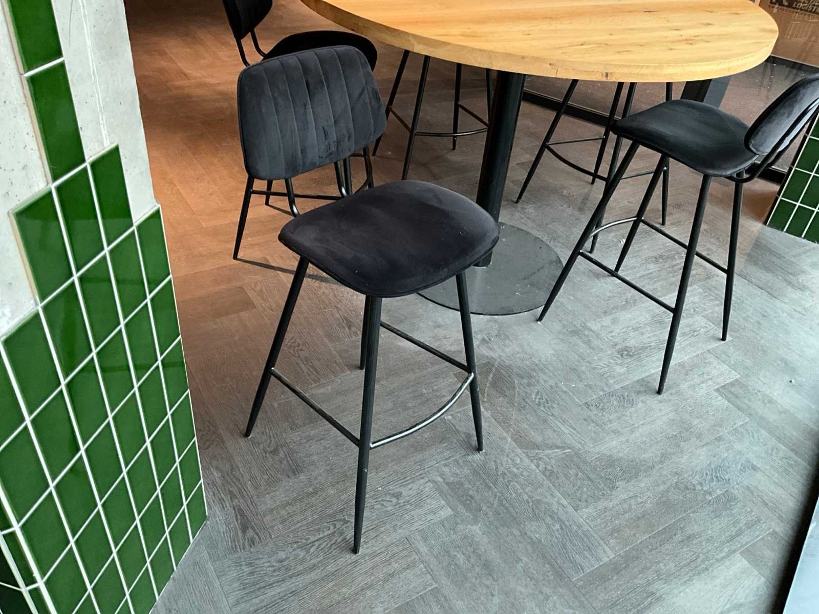 Met 5 stuks zwart gestoffeerde zit krukken Merk: Satelliet Type: Rond hoog Totale afmeting Breedte: 1500mm Totale afmeting Hoogte: 1080mm Hout: true Metaal: true