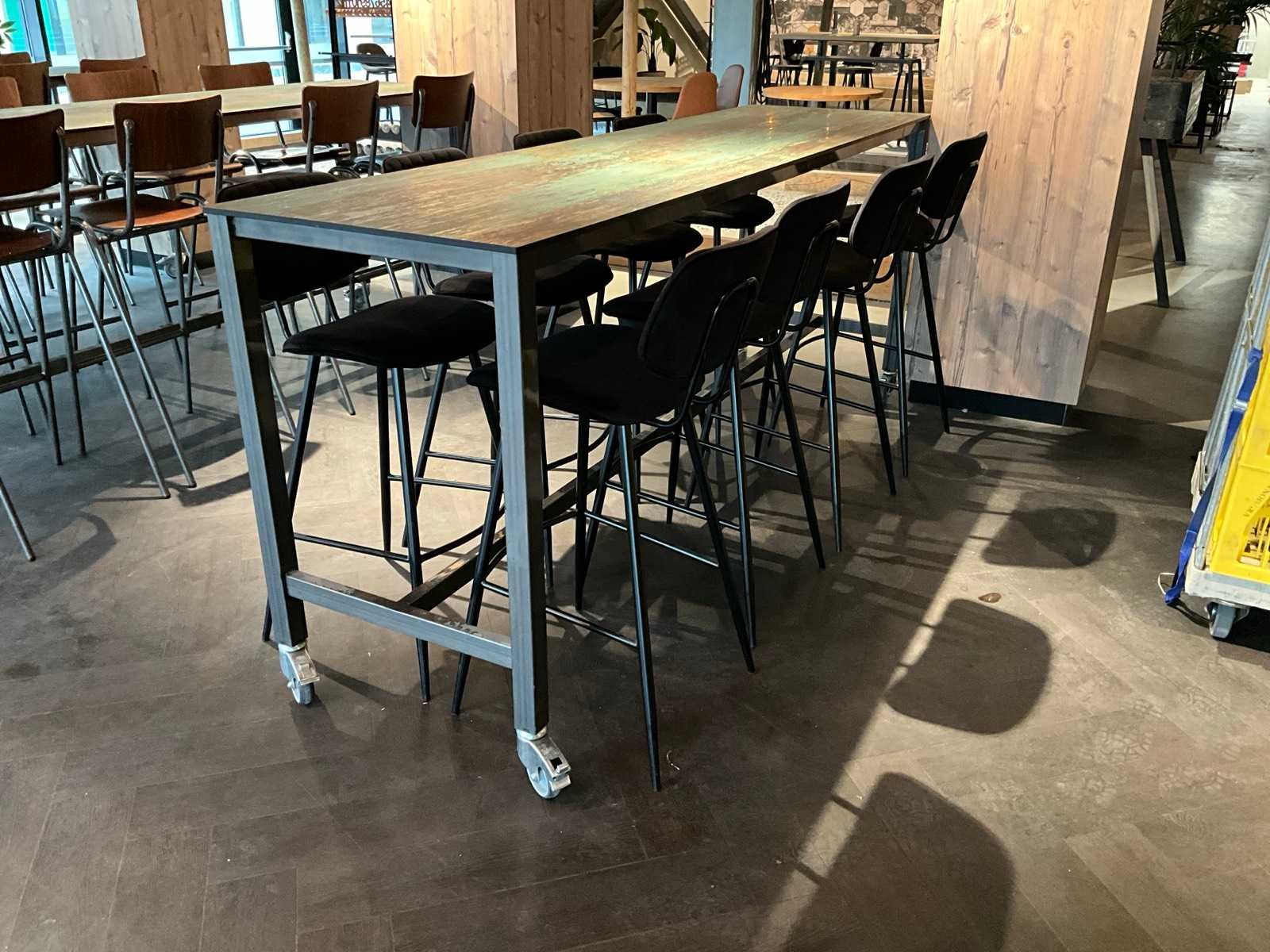 Voorzien van trespa topblad en 8 zitkrukken voorzien van zwart gestoffeerde zitting Type: Hoog Totale afmeting L: 2600mm Totale afmeting Breedte: 700mm Totale afmeting Hoogte: 1070mm Kunststof: true Metaal: true