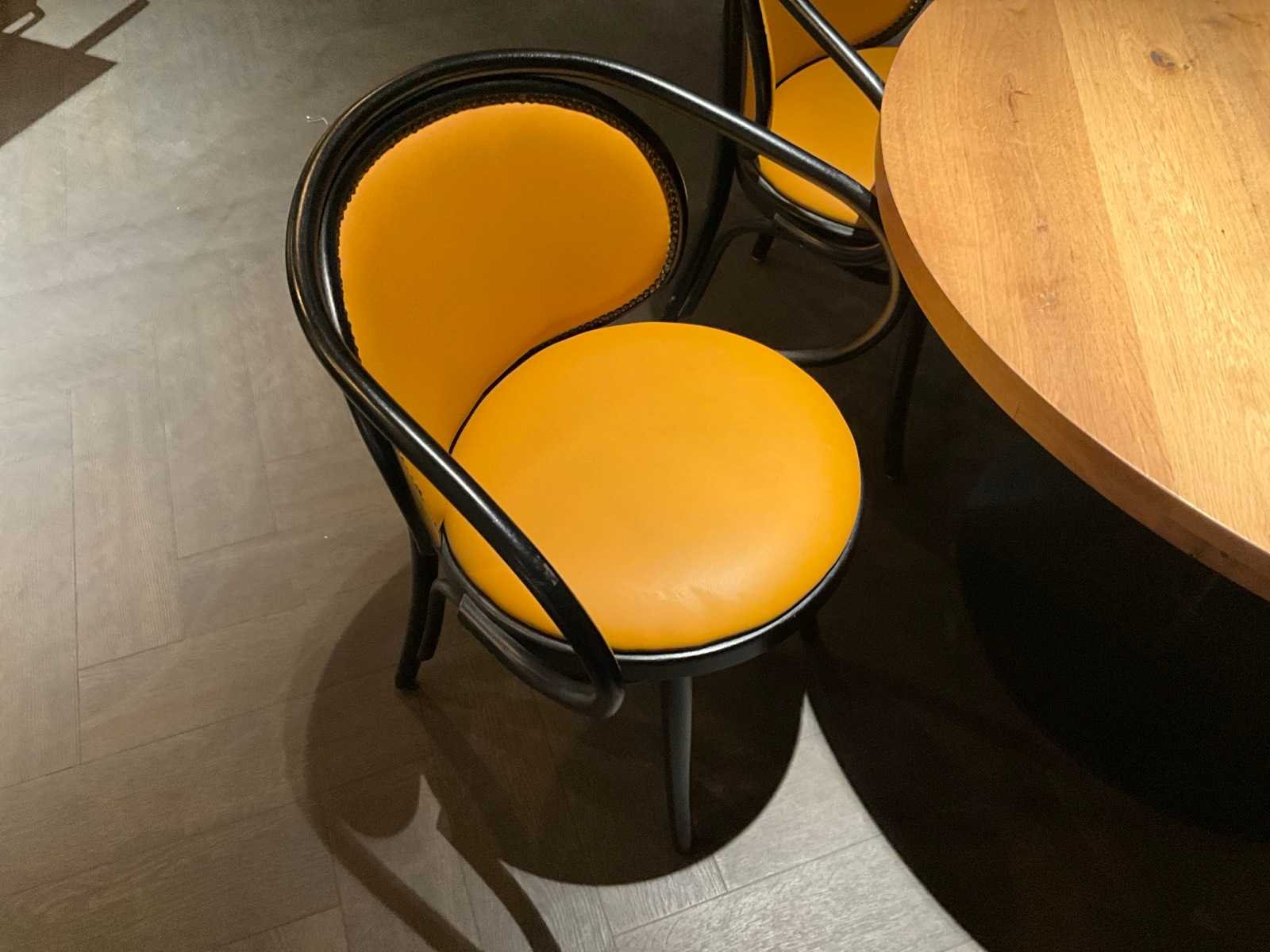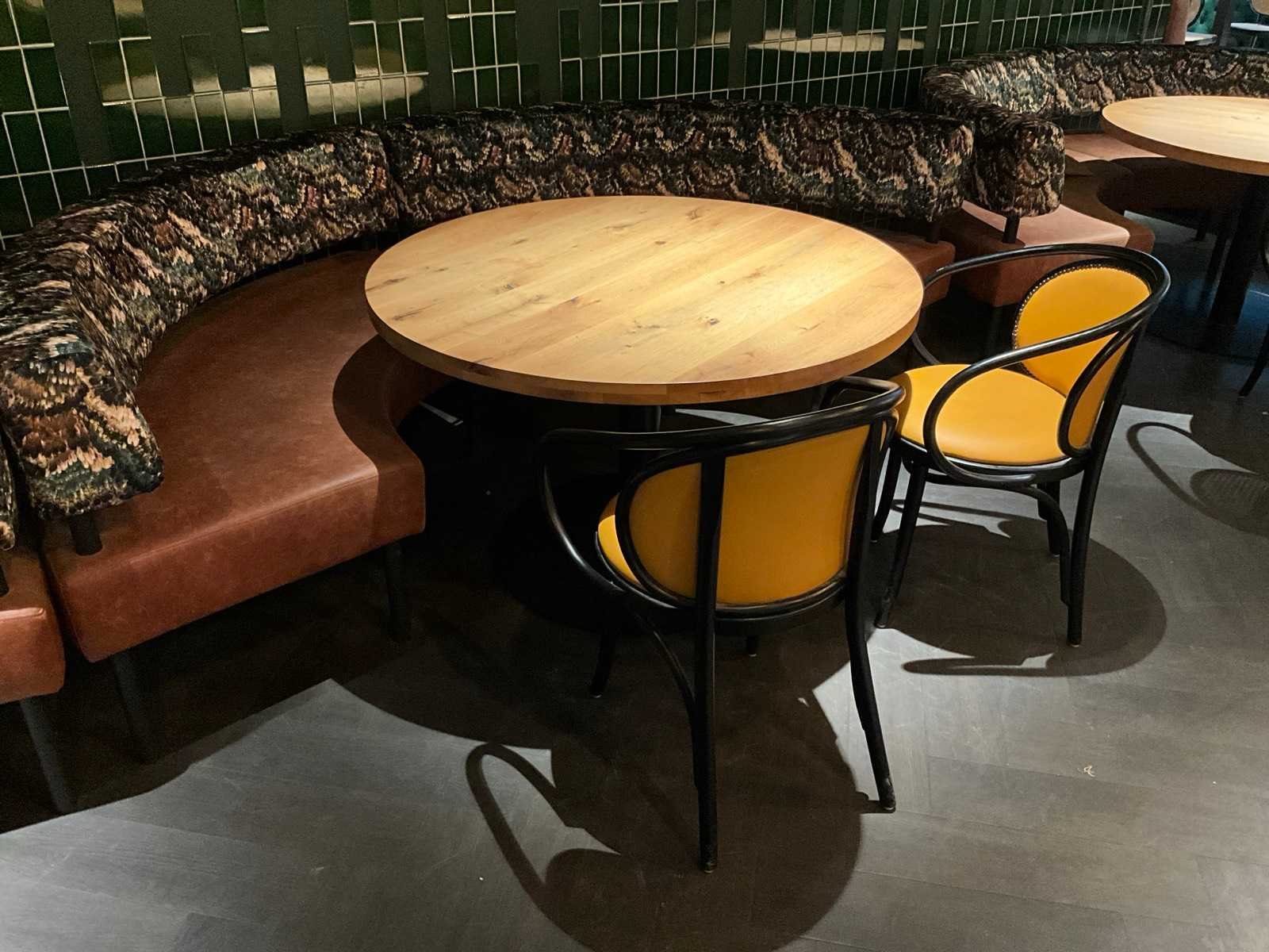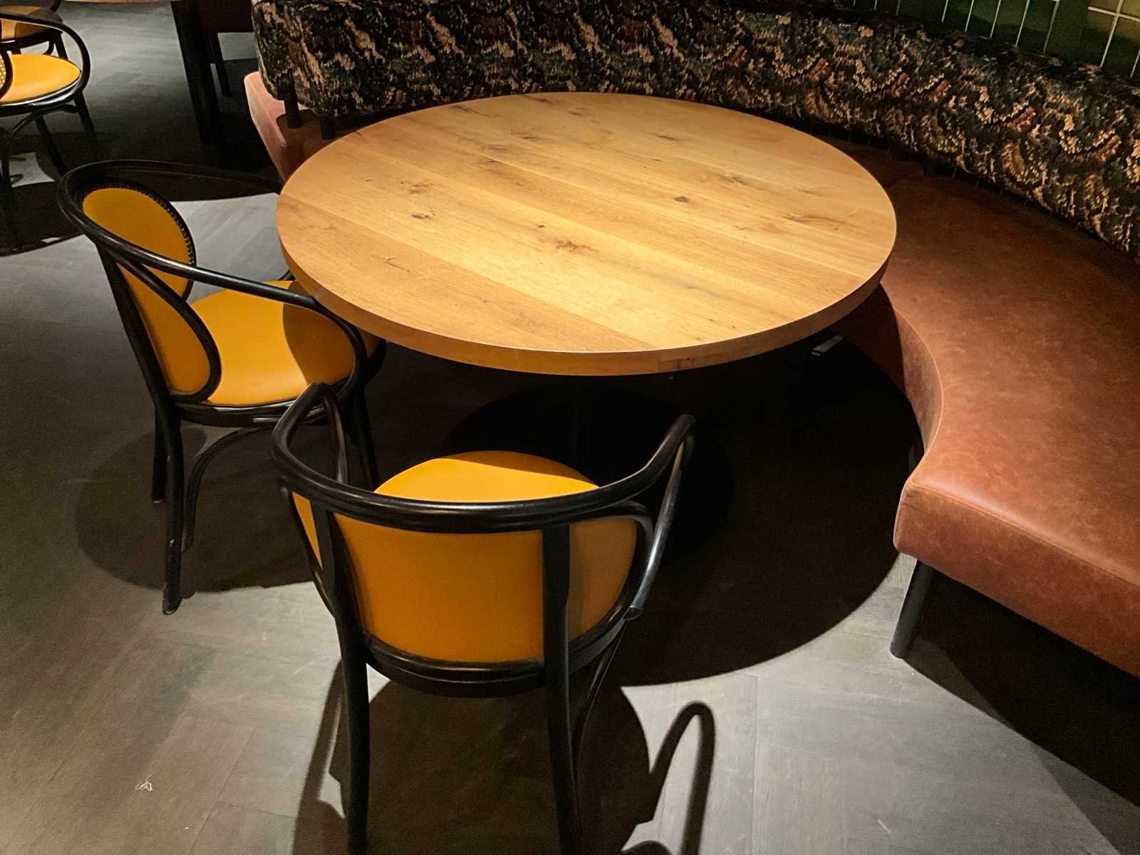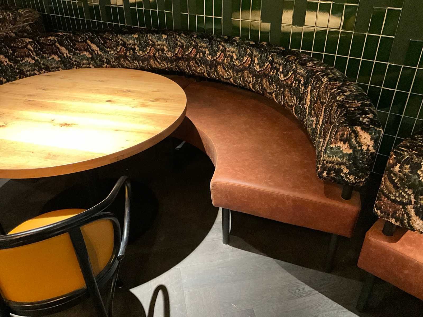 Bestaande uit 2 stuks kwartronde bank afmeting 180x70x86 cm voorzien van sky leder beklede zittijd en stof beklede rugleuning, 1 ronde eettafel diameter 121cm hoogte 75cm, en 2 stoelen Type: Halfrond