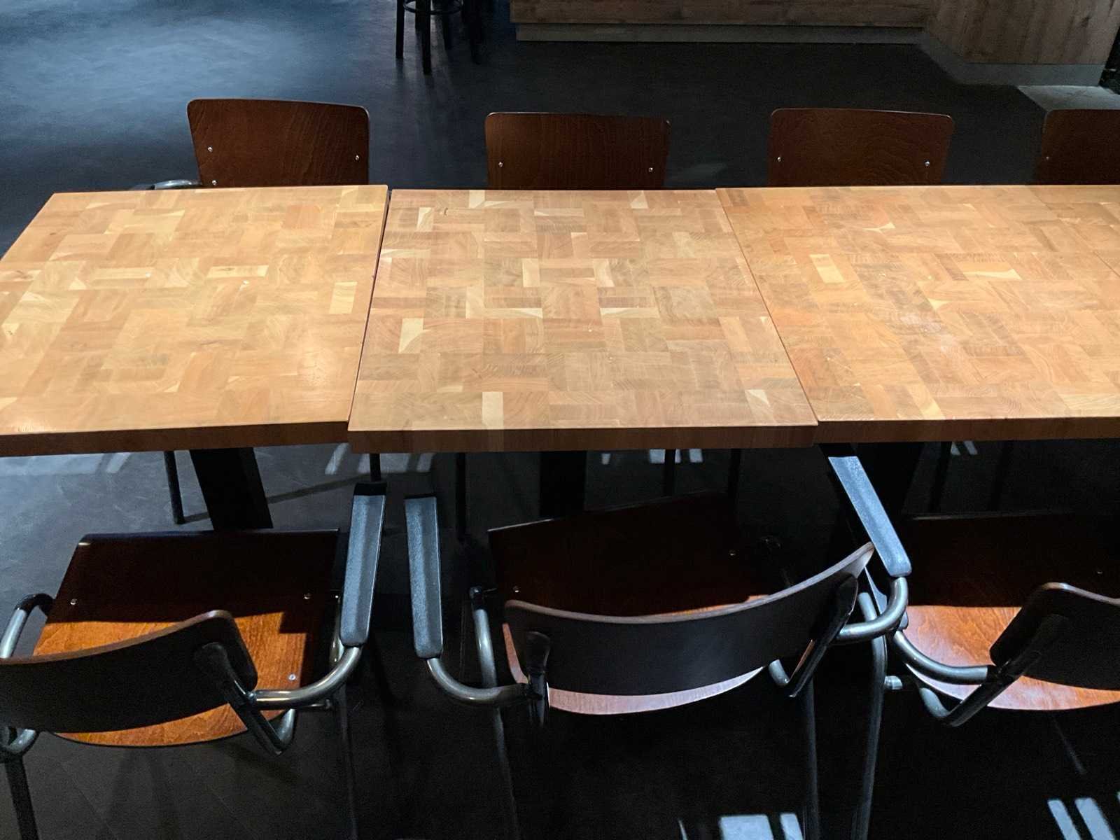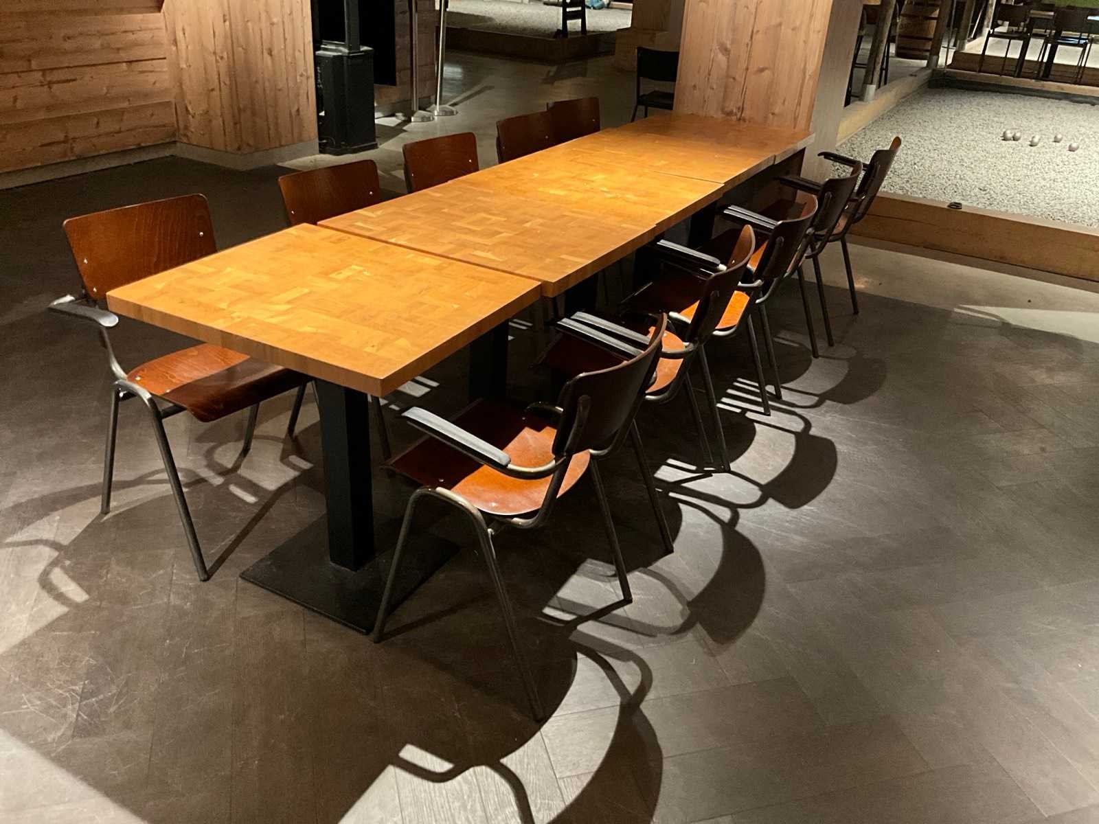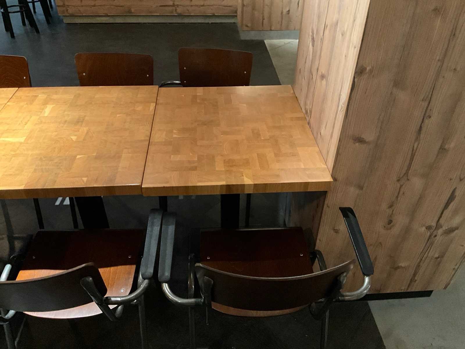Voorzien van 5 tafels afmeting 70x60x76cm en 10 stuks stoel met houten zit en rug gedeelte