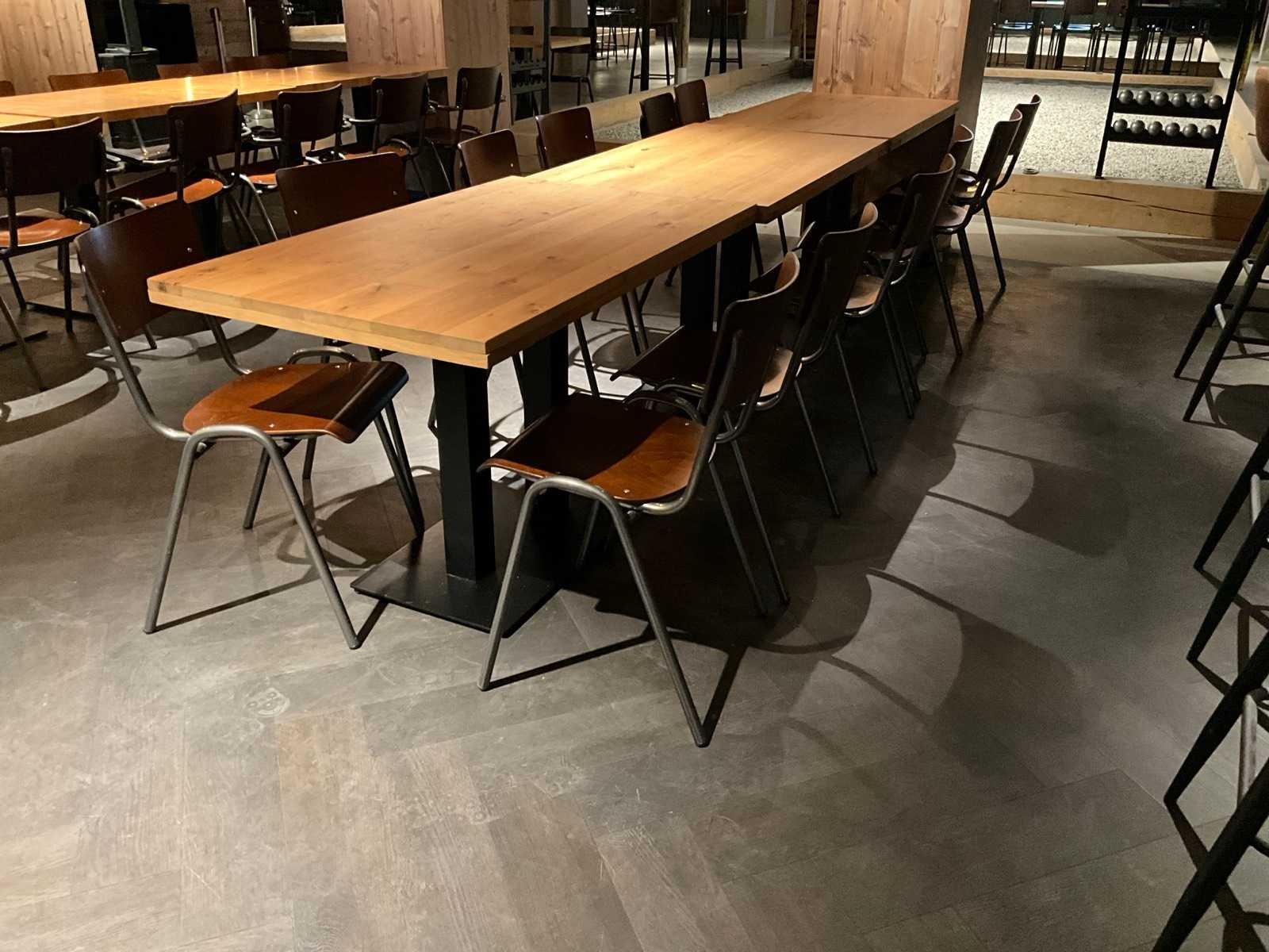 Voorzien van 3 tafels afmeting 120x70x76cm en 12 stuks stoel met houten zit en rug gedeelte