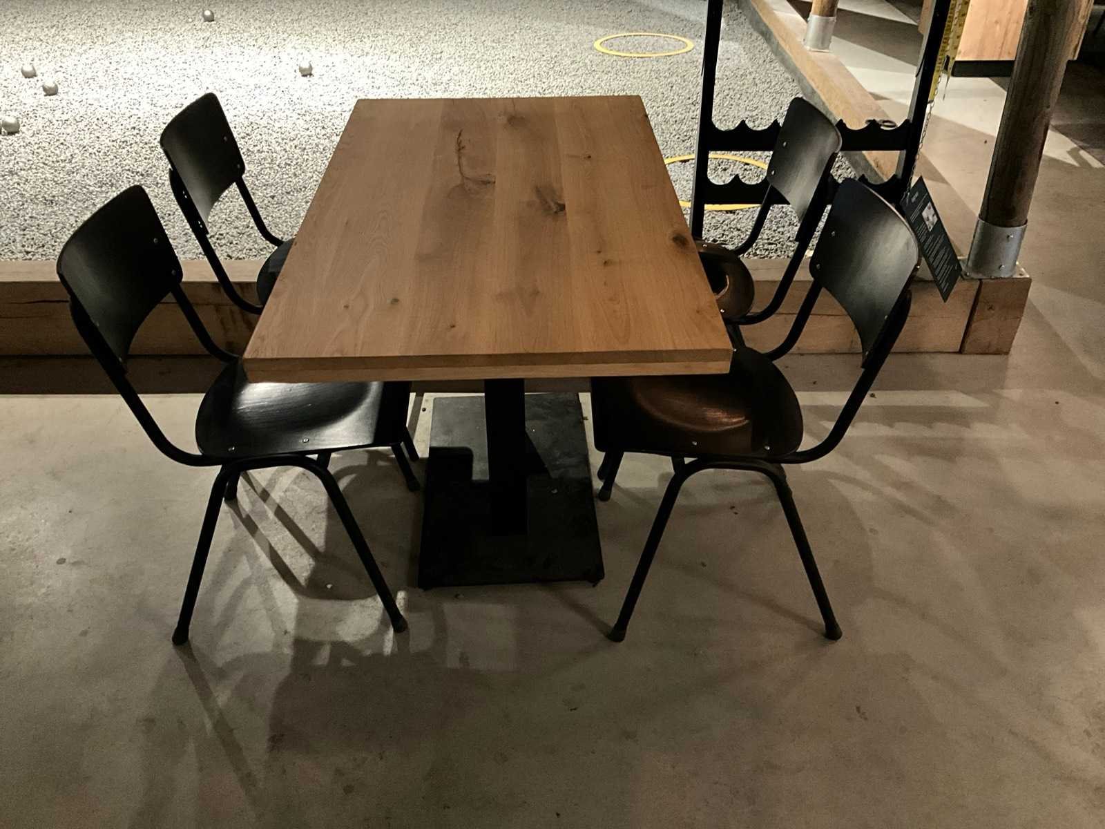 Met 4 stoelen voorzien van houten zit en rugleuning Merk: Satelliet Type: Rechthoek Totale afmeting L: 700mm Totale afmeting Breedte: 1200mm Totale afmeting Hoogte: 750mm Hout: true Metaal: true