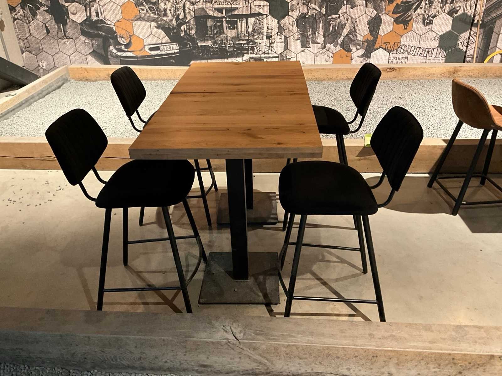 Met 4 stuks hoge zitkruk zwart gestoffeerd Totale afmeting L: 700mm Totale afmeting Breedte: 700mm Totale afmeting Hoogte: 920mm Hout: true Metaal: true