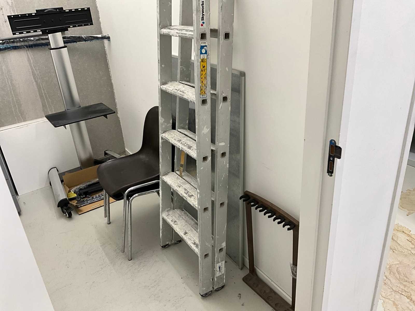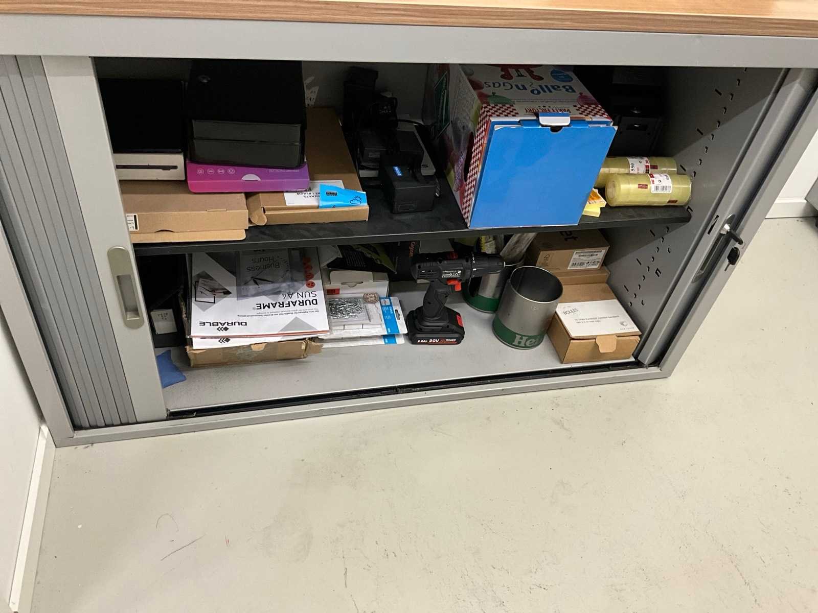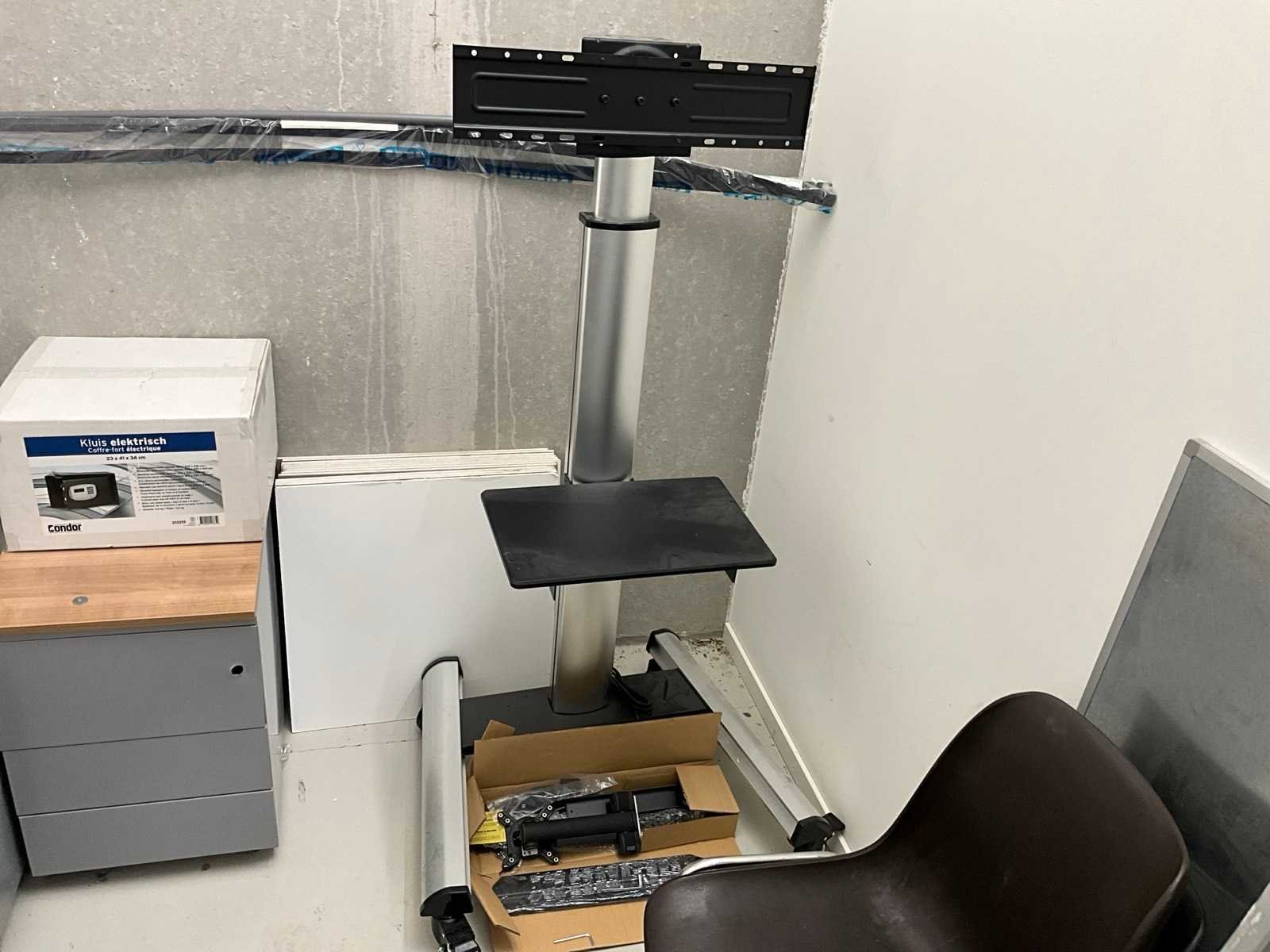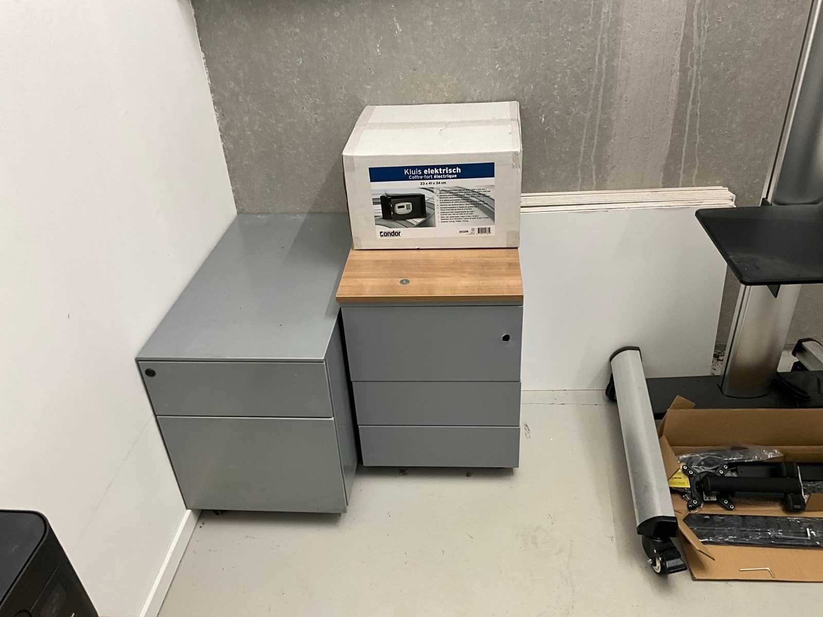 Waaronder 2 stuks ladekast, 1 schuifdeurkast met diverse inhoud, trap, tv trolley, lockerkast en divers