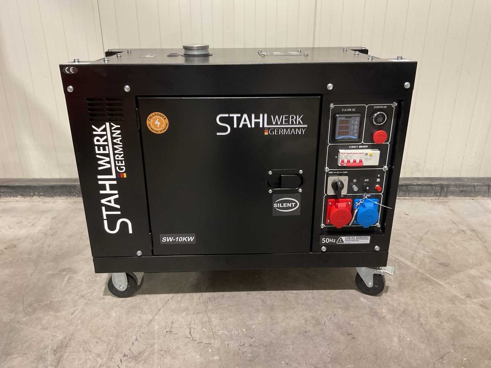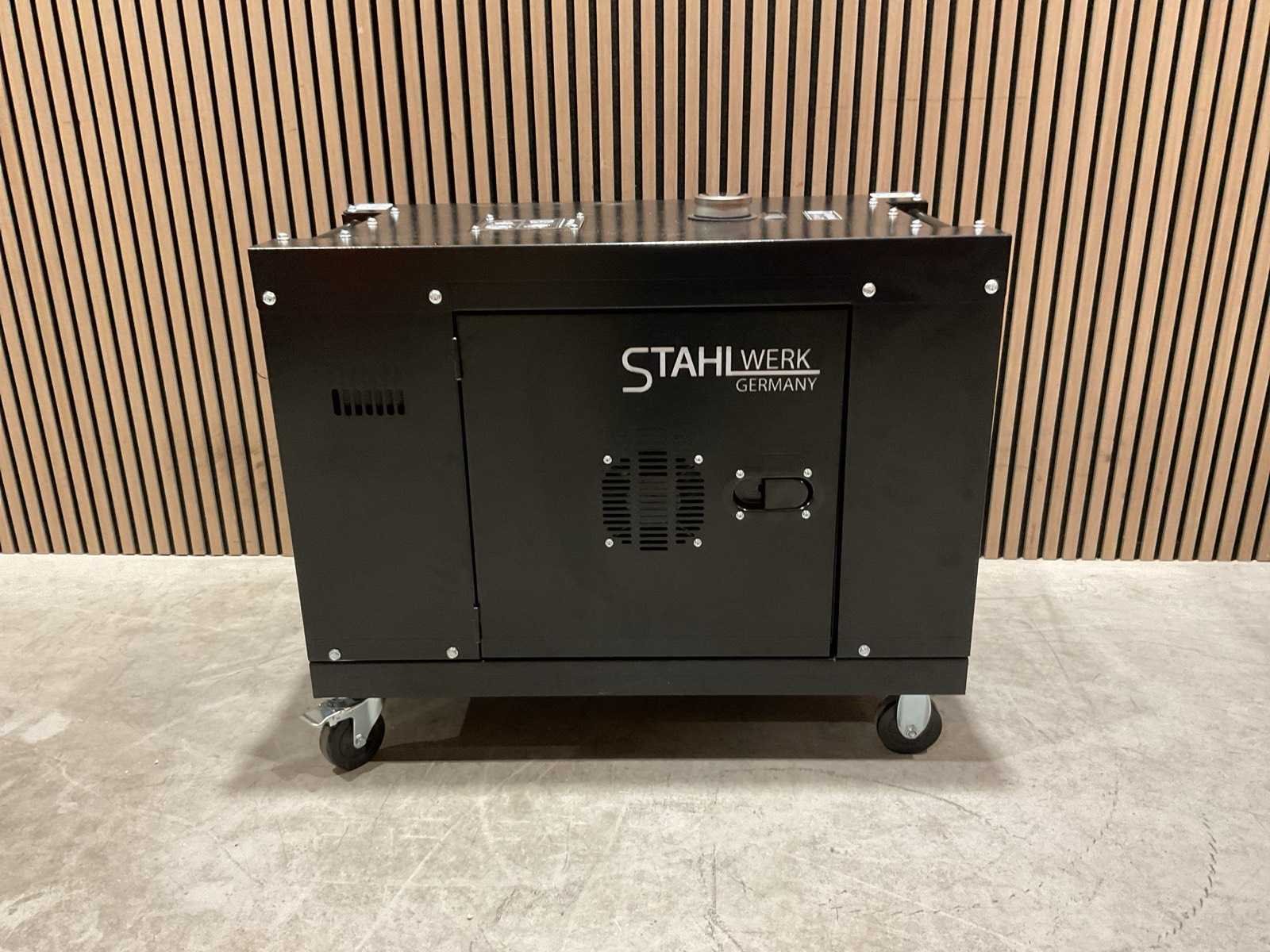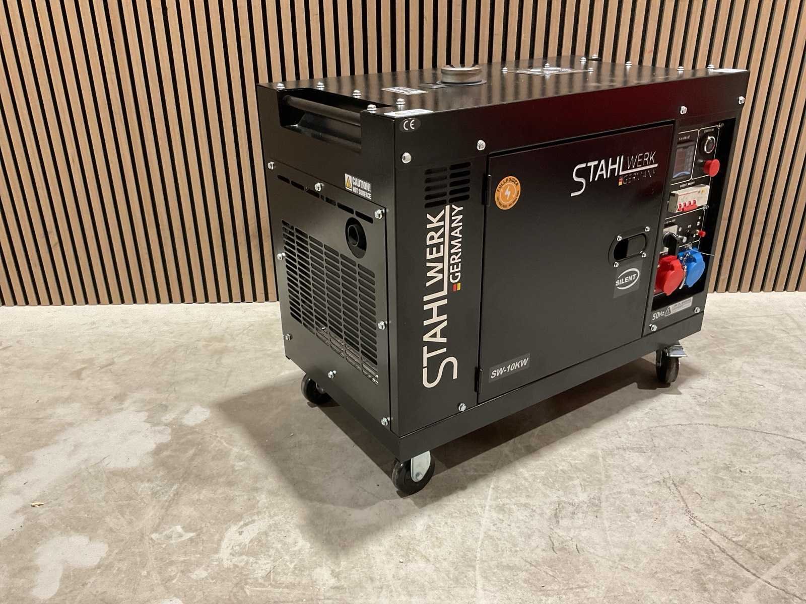 Voorzien van Dieselmotor; Cilinderinhoud: 532 CC; Motorvermogen: 11,0 HP; Uitgangsvermogen (nominaal): Enkel fase: 7,9 kVA, Drie fase: 8,8 kVA; Maximaal uitgangsvermogen: Enkel fase: 8,8 kVA, Drie fase: 9,8 kVA, Brandstoftank: 15 liter; Oliecapaciteit: 1,65 liter; Elektrisch (Electric Start); Display: LED; Geluidsniveau: 72 dB(A) @ 7 meter; Bedrijfstijd bij 75% belasting: 7,0 – 7,5 uur; AC-uitgangen: 1x 230V / 32A (3-pins), 1x 400V / 16A (5-pins); Ongebruikt (Transport afmeting; 980x56x860mm; Gewicht 182 kg) Merk: Stahlwerk Type: SW-10KW Bouwjaar: 2025 Capaciteit.: 10kVA Diesel: true Mobiel: true Handboek aanwezig: true Machinegewicht: 170kg Totale afmeting L: 960mm Totale afmeting Breedte: 820mm Totale afmeting Hoogte: 540mm