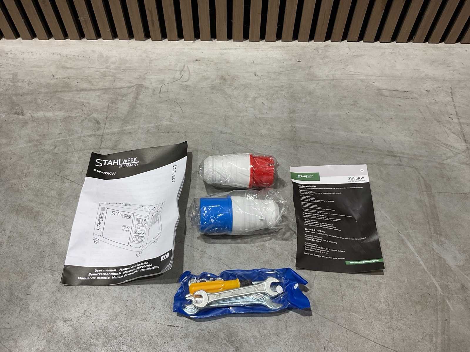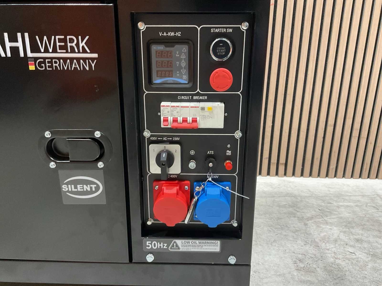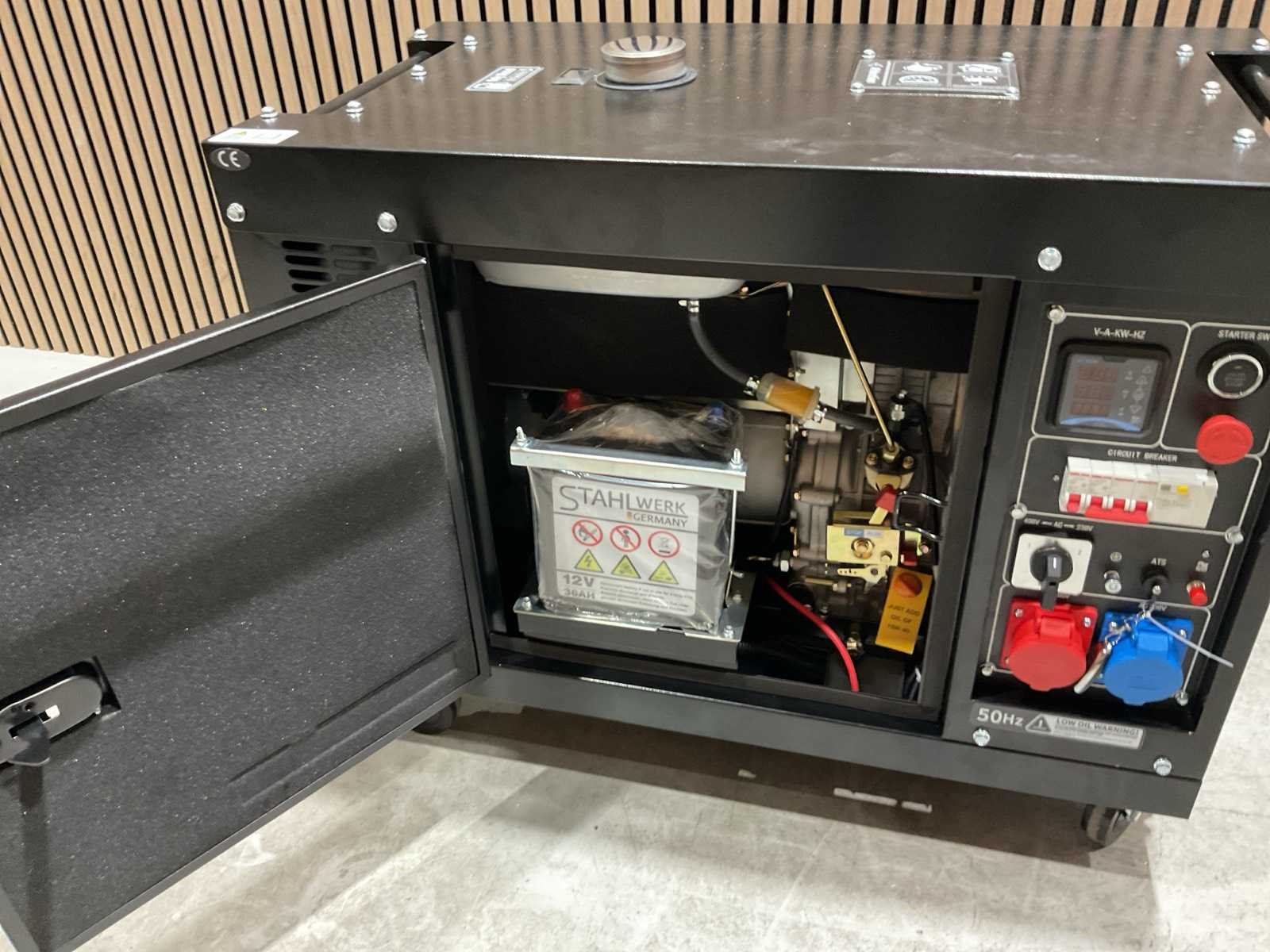 Voorzien van Dieselmotor; Cilinderinhoud: 532 CC; Motorvermogen: 11,0 HP; Uitgangsvermogen (nominaal): Enkel fase: 7,9 kVA, Drie fase: 8,8 kVA; Maximaal uitgangsvermogen: Enkel fase: 8,8 kVA, Drie fase: 9,8 kVA, Brandstoftank: 15 liter; Oliecapaciteit: 1,65 liter; Elektrisch (Electric Start); Display: LED; Geluidsniveau: 72 dB(A) @ 7 meter; Bedrijfstijd bij 75% belasting: 7,0 – 7,5 uur; AC-uitgangen: 1x 230V / 32A (3-pins), 1x 400V / 16A (5-pins); Ongebruikt (Transport afmeting; 980x56x860mm; Gewicht 182 kg) Merk: Stahlwerk Type: SW-10KW Bouwjaar: 2025 Capaciteit.: 10kVA Diesel: true Mobiel: true Handboek aanwezig: true Machinegewicht: 170kg Totale afmeting L: 960mm Totale afmeting Breedte: 820mm Totale afmeting Hoogte: 540mm