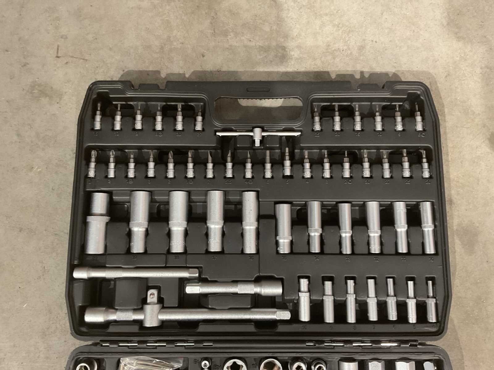 13 stuks 1/4 " Socket: 4,4,5,5,5,5,6,7,8,9,10,11,12,13,14 mm; 7 stuks 1/4 " diepe wandcontactdoos 4,5,6,7,8,9,10 mm; 5 stuks 1/4 " E-doppen E4, E5, E6, E7, E8; 2 stuks 1/4 " verlengstang 2 'en 4"; 1 stuk 1/4 " Sliding T-Bar; 1 stuk 1/4 " universele koppeling; 1 stuk 1/4 " koppeling; 1 stuk 1/4 " Quick Release ratelhendel; 30 stuks 1/4 " Bit-doppen; 10 stuks 3/8 " Doppen 10,11,12,13,14,15,16,17,18,19mm; 6 stuks 3/8 " Sockets 10,11,12,13,14,15; 5 stuks 3/8 " E-doppen E10, E11, E12, E14, E16, E18; 1 stuk 3/8 " Extention Bar 5"; 1 stuk 3/8 " koppeling ;1 stuk 3/8 " Bougie Dop 18 mm; 1 stuk 3/8 " Quick Release Ratchet Hanlde;18 stuks 1/2 " Sockets 10,11,12,13,14,15,16,17,18,19,20,21,22,23,24,27,30,32mm; 5 stuks 1/2 " diepe doppen 16,17,18,19,22 mm; 3 stuks 1/2 " E-doppen E20, E24; 2 stuks 1/2 " Extension Bar 5" & 10 "(met driewegadapter); 1 stuk 1/2 " universele verbinding; 1 stuk 1/2 " koppeling; 2 stuks 1/2 " Bougie Dop 16 mm en 21 mm; 1 stuk 1/2 " Quick Release ratelhendel; 1 stuk Inbussleutel Set 1,1.5,2,2.5,3,4,5mm; 20 stuks 25mm bits in bits houder; 24 stuks 30mm bits; 1 stuk spinnerhandvat; Ongebruikt in doos (Transport afmeting 460 x 95 x 350, Gewicht 8.68 KG) Merk: KW Tools Met koffer: true Delig: 172 Type: 172PCS Socket Set Bouwjaar: 2025