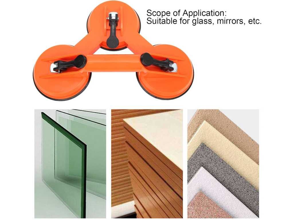 Stanford | Glasdrager met drie zuignappen met hefboomsluiting. Grote zuigkracht, Heavy Duty. Geschikt voor het liften van platte, gladde materialen zoals glas, plastic, metaal, gecoat hout, marmer etc. Ook toepasbaar voor automotive: uitdeuken. De driedubbele vacuümheffer is gemaakt van kunststof en is geschikt voor het optillen van ladingen tot maar liefst 130 kg. Bezorgtermijn 7 dagen Merk: Glasdrager | Model: 130 kg.