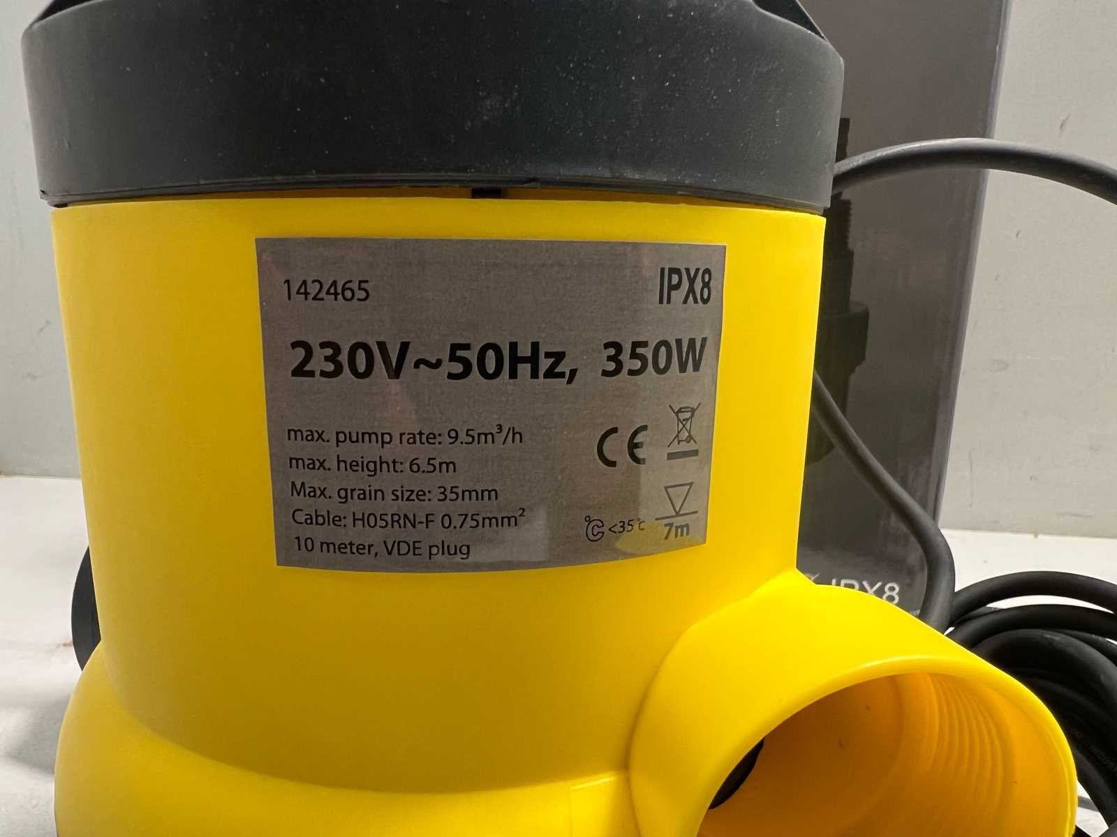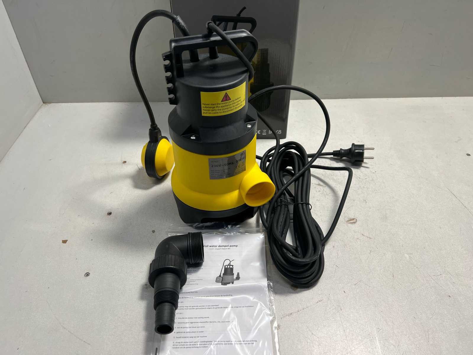 Dompelpomp met vlotter 350W. Vuilwater dompel / klok pomp. Voorzien van vlotter voor het automatisch in- en uitschakelen Vermogen: 350 Watt Capaciteit: 9500ltr. per uur Max opvoerhoogte: 6,5mtr. Max. diepte: 7mtr. Kabel lengte: 10 meter Verpakt in fotodoos Bezorgtermijn 14 dagen Merk: Dompelpomp Model: ipx8 Kleur: geel