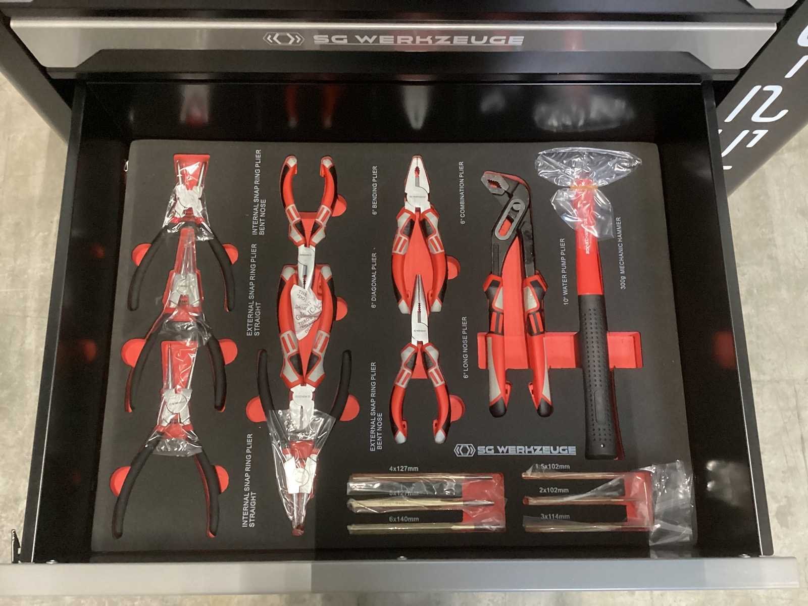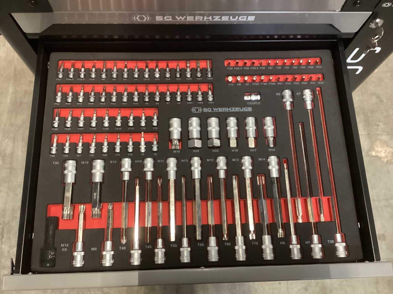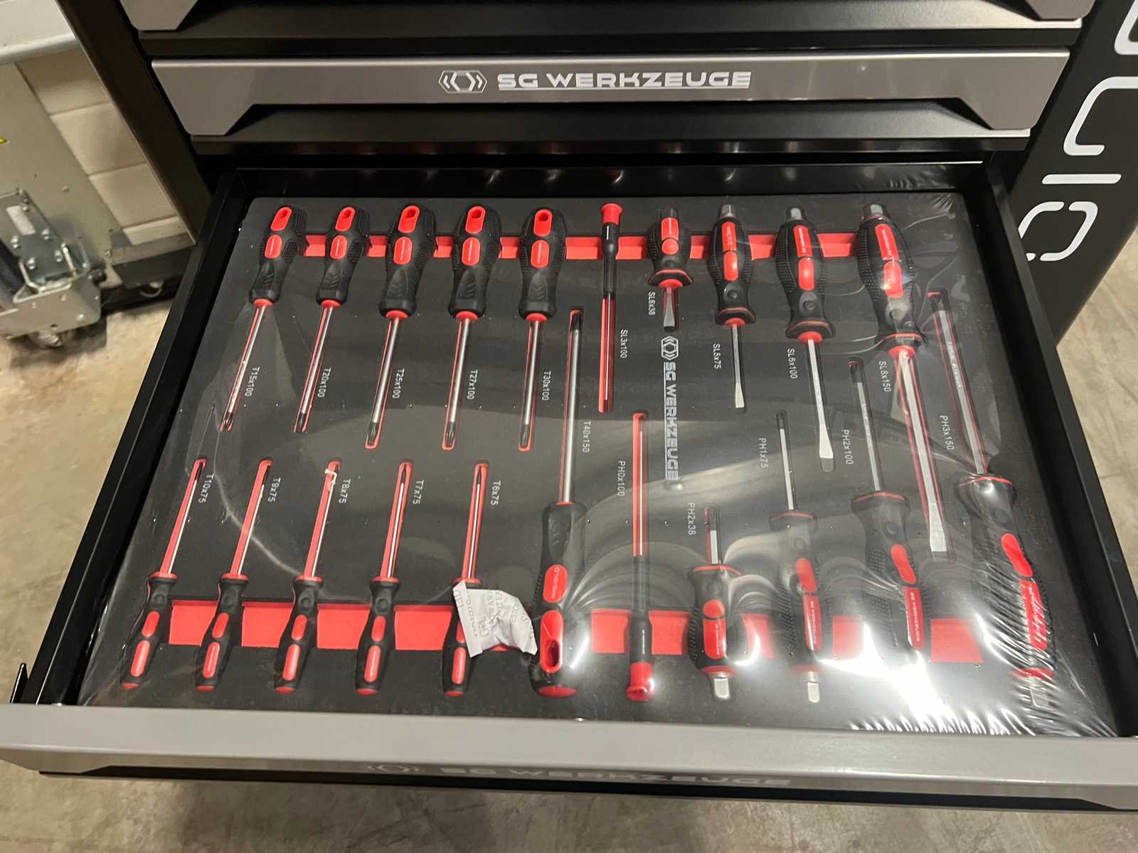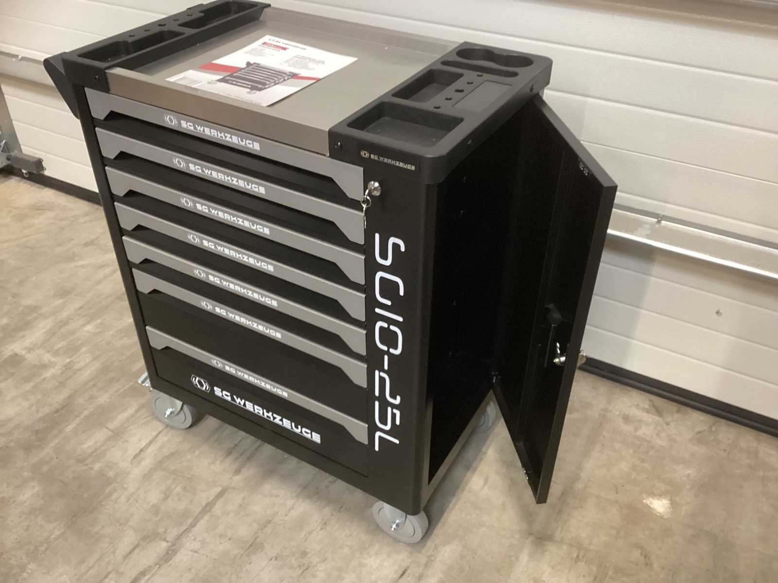 7 Laden - 7 Gevuld 258 pcs Gereedschap Zwarte kar met zilveren grepen afgewerkt 2 zwenkwielen geremd Bezorgtermijn 7 dagen Merk: Sg werkzeuge