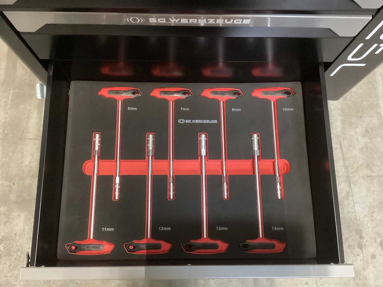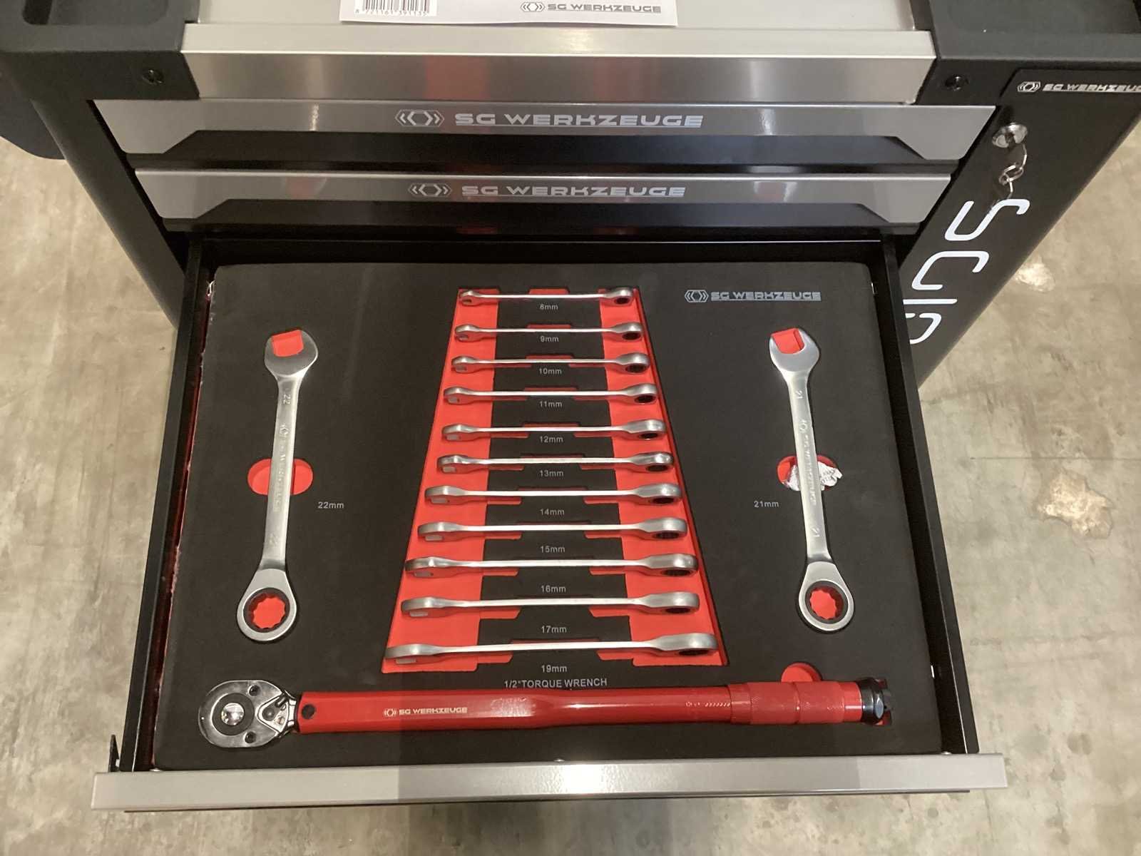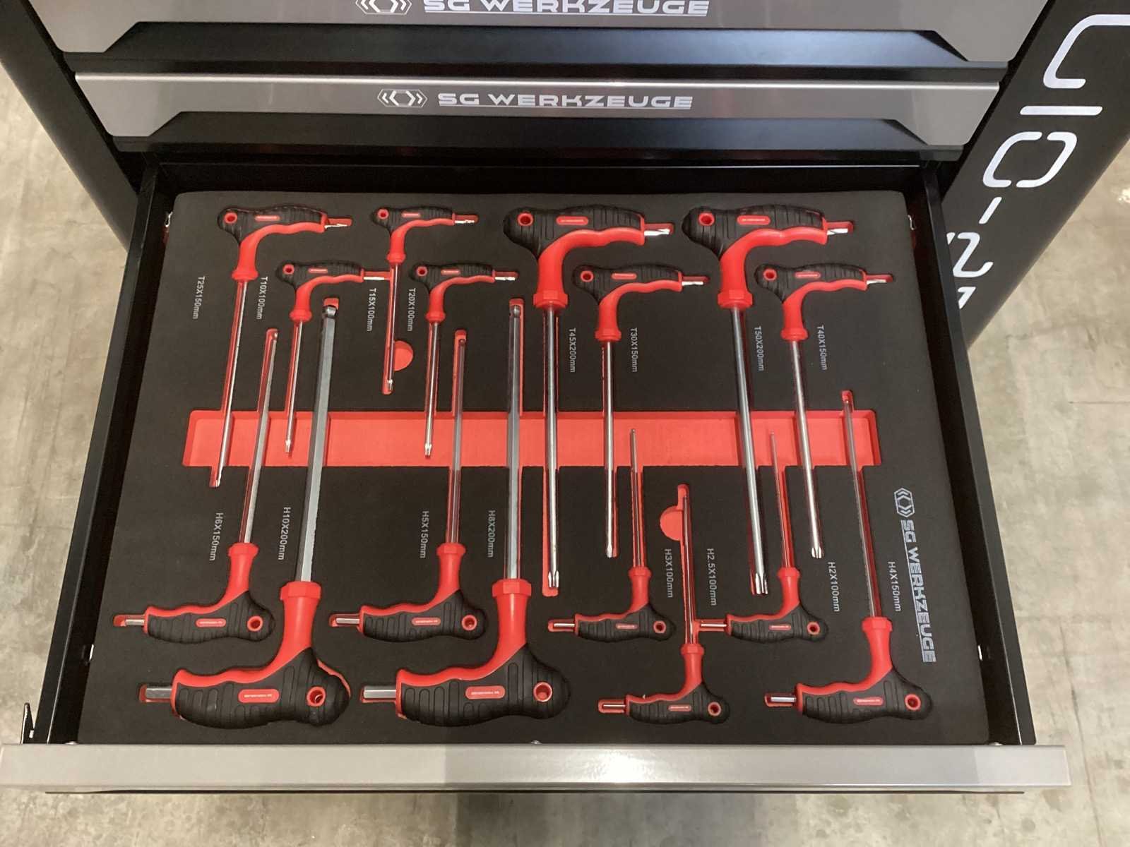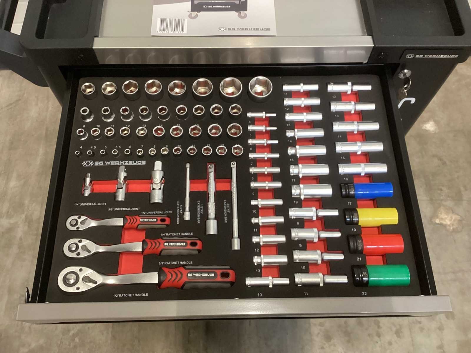 7 Laden - 7 Gevuld 258 pcs Gereedschap Zwarte kar met zilveren grepen afgewerkt 2 zwenkwielen geremd Bezorgtermijn 7 dagen Merk: Sg werkzeuge