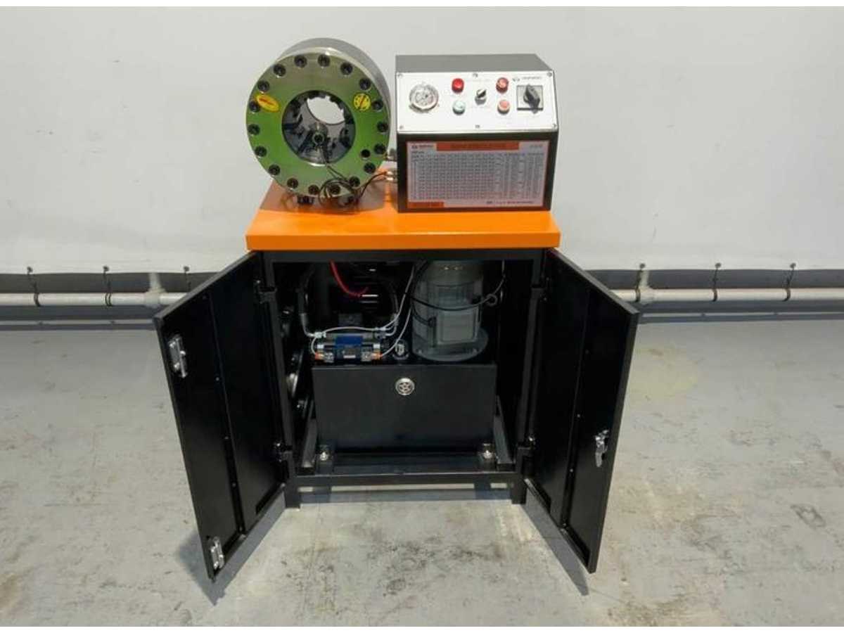 Bouwjaar: 2025. Hydraulische slangenpers; Krimpbereik: 15-63mm, Max opening: 75mm, Voltage: 380V, Wattage: 3000W, Druk: 53,5 Mpa Verpakking formaat: 780x540x1350 Gewicht Incl. Verpakking: 280 Kg Ongebruikt. Bezorgtermijn 7 dagen Merk: Daewoo Type: DA5100-HC- Hydraulische pers