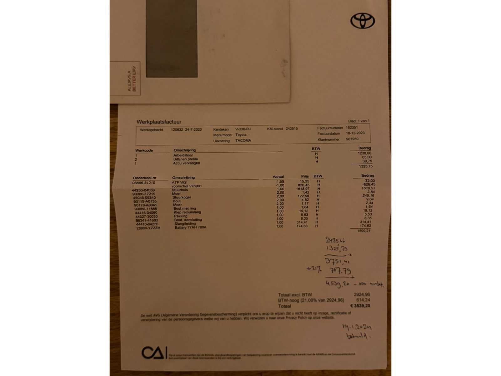 Omdat dit kavel niet in Spijkenisse staat moet u ons een mail, info@collectcars.nl sturen dan krijgt u van ons het adres. Vermeld wel het veilingnummer en kavelnummer zodat het voor ons makkelijker zoeken is. Alvast bedankt Kenteken: V-330-RJ Merk: Toyota Model: Tacoma Type: 4.0 V6 4x4 TRD Off Road pick up V-330-RJ Cilinderinhoud: 4000cc Vermogen (kW): 176kW Brandstof: Benzine Afgelezen mijlenstand: 250914mi Chassisnummer: 5TEUU42N55Z082031 Laadvermogen: 526kg Datum eerste toelating: 2005-02-28 Datum eerste toelating (NL): 2018-07-19 APK vervaldatum: 2025-12-06 Aantal zitplaatsen: 4 Kleur: niet van toepassing Stuurwiel: links Emissieklasse: 4 Ledig gewicht: 1900kg Bruto BPM (NL): 7005€ Aantal cilinders: 6 Carrosserie: pick-up truck Onderhoudshistorie: Ja gedeeltelijk Carfax Link: https://was.carfax.eu/v0/api/ccdid/5100016408/svc/201/vinreg/V330RJ/checksum/eyJhbGciOiJIUzI1NiIsInR5cCI6IkpXVCJ9.eyJleHAiOjE3NzA4MzcyNzR9.dUhK51tiOysYZeJDPWPjy44A2QskzLt4Hl1GWBU8l-4 startinformatie : Start en rijdt