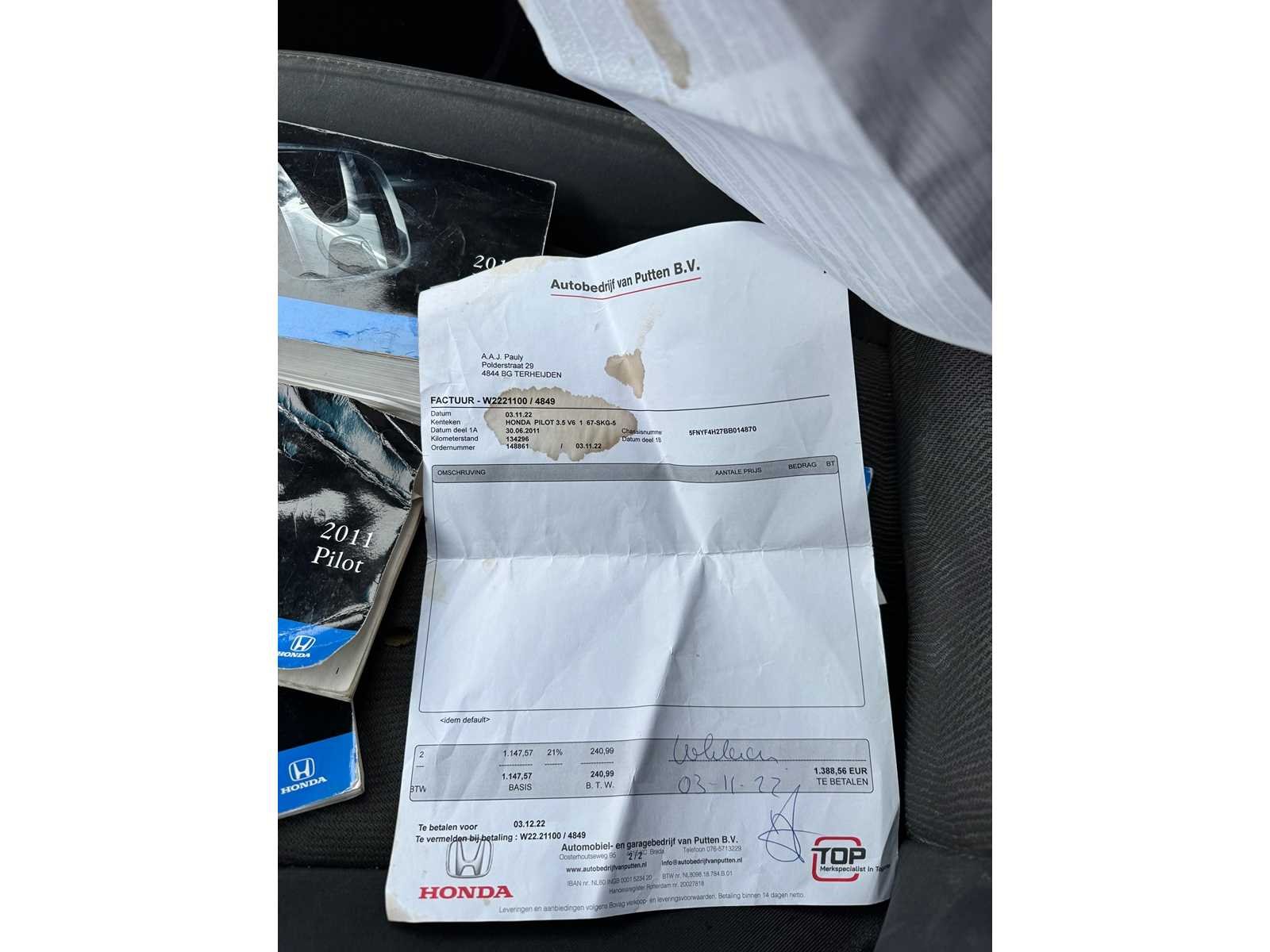 Omdat dit kavel niet in Spijkenisse staat moet u ons een mail sturen naar info@collectcars.nl, dan krijgt u van ons het adres. Vermeld wel het veilingnummer en kavelnummer zodat het voor ons makkelijker zoeken is. Kenteken: 67-SKG-5 Merk: Honda Model: Pilot Type: 3.5 V6 24V i-VTEC 4x4 Cilinderinhoud: 3471cc Vermogen (kW): 185kW Brandstof: Benzine Afgelezen mijlenstand: 153082mi NAP status: Onlogisch Datum eerste toelating: 2011-06-30 Datum eerste toelating (NL): 2011-10-07 Aantal zitplaatsen: 8 Kleur: grijs Transmissie: Automaat Stuurwiel: links Emissieklasse: 5 Aantal deuren: 4 Ledig gewicht: 2017kg Bruto BPM (NL): 64097€ Aantal cilinders: 6 Carrosserie: stationwagen Nationaliteit documenten: Nederland Onderhoudshistorie: Ja gedeeltelijk Carfax Link: https://was.carfax.eu/v0/api/ccdid/5100016408/svc/201/vinreg/67SKG5/checksum/eyJhbGciOiJIUzI1NiIsInR5cCI6IkpXVCJ9.eyJleHAiOjE3NzEwOTU0ODZ9.M-5h0tmzl2C5WjamBCe8w5b20fx4EJHrAa3s9kHJ5g0 startinformatie : Start en rijdt Airconditioning: true Navigatie: true Xenon verlichting: true LED-koplampen: true Vierwielaandrijving 4x4: true