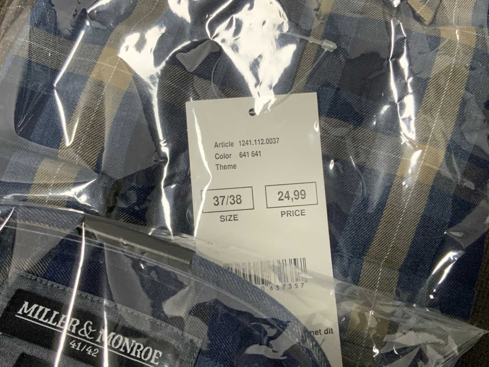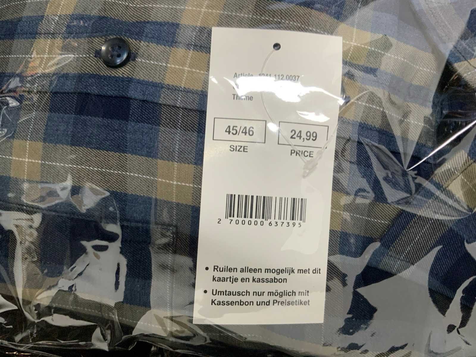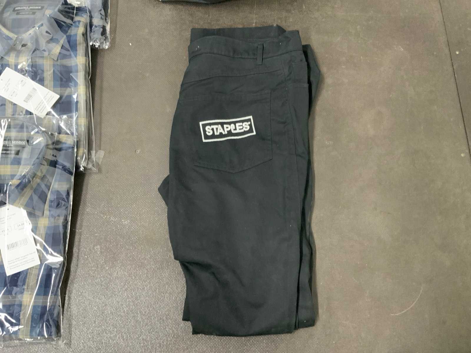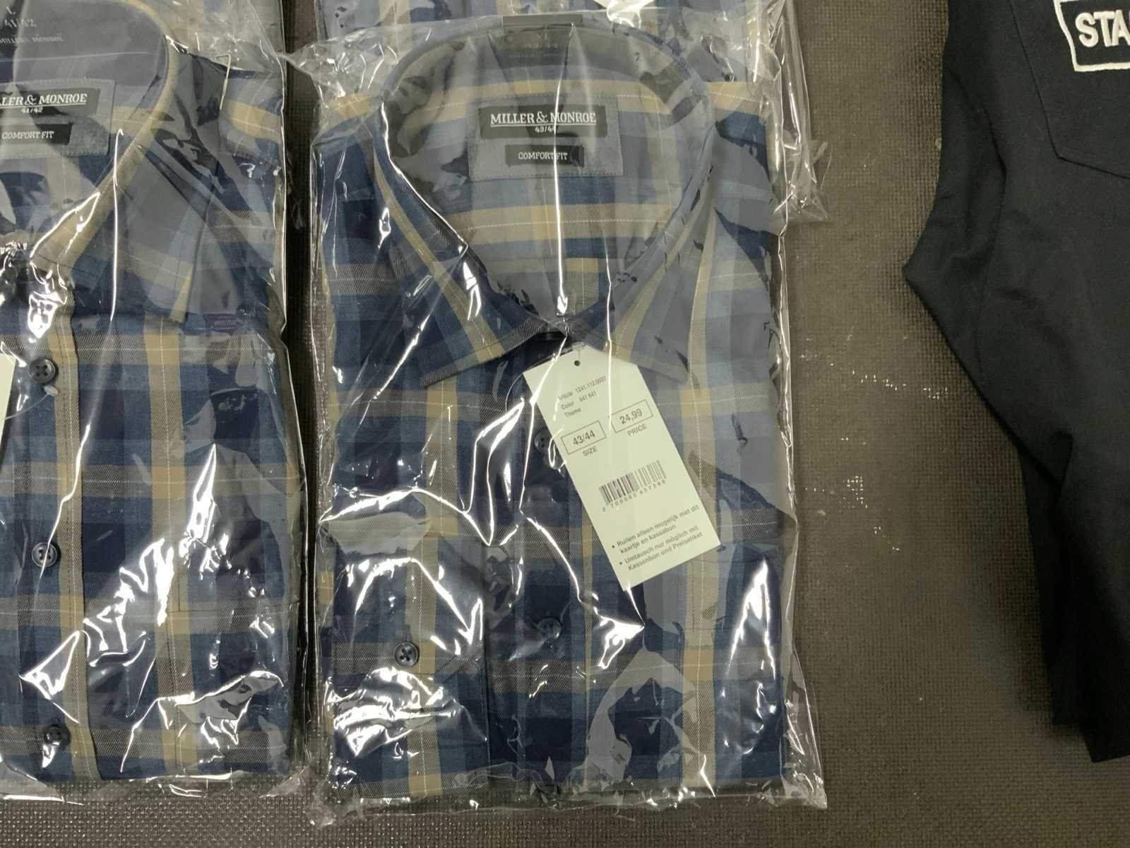 Geruite overhemden van Miller & Monroe, diverse maten; Werkbroek van Staples, maat 48; Polo's van Office Centre, maat XL (2x) en XXL (1x); diverse kleding