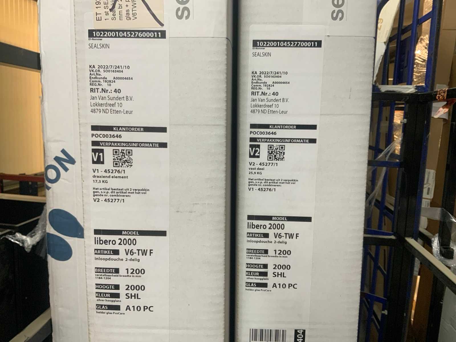 Draaiend element 200x120 cm; 17,3kg; Vaste deel 200x120 cm; 25,9kg; Helder glas ProCare; Let op: twee dozen, eerste foto ter illustratie, zonder douchekop Merk: Sealskin Model: Libero 2000 Kleur: Zilver hoogglans