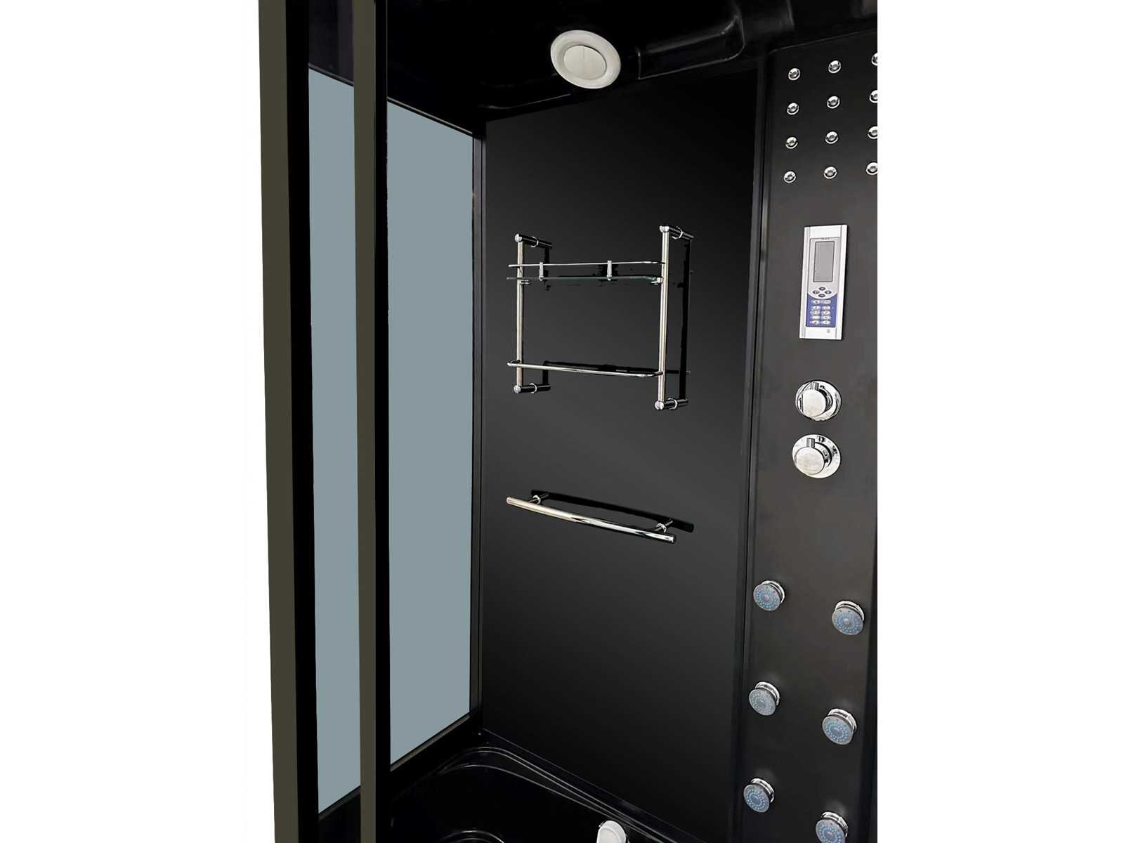 Type: LR8034B Model: Stoomcabine met massagebad - Rechthoekig Afmeting: 1700x900x2200mm Kleur: Zwarte cabine met zwart bad Aantal jets: De cabine heeft waterjets die zorgen voor een aangename rugmassage Voorzien van:- Gekleurd veiligheidsglas wat zorgt voor extra veiligheid in de stoomcabine. Dankzij het veiligheidsglas hoef u zich nooit zorgen te maken over scherven op de vloer want het is stootbestendig en sterk. Mocht het toch gebeuren dat het glas barst, dan zal het uiteenvallen in onscherpe stukjes.- Voorzien van 2 schuifdeuren- Topverlichting- Sfeerverlichting - Ventilator - Handdouche - Topdouche - Functie voor een aangename voetmassage - Handdoekrekje met planchet - Zeep en shampoo dispenser - Aroma therapie: vul de aromahouder met uw favoriete aroma’s zoals het welbekende eucalyptus om heerlijke geuren te verspreiden tijdens het stomen - Cabine staat op verstelpoten die eenvoudig zijn te stellen in hoogte Bezorgtermijn 14 dagen Merk: Vonato Model: RectaSpa Hydro Product type: met massagejets Kleur: Zwarte cabine, wit bad Lengte: 170cm Hoogte: 220cm Materiaal: Veiligheidsglas