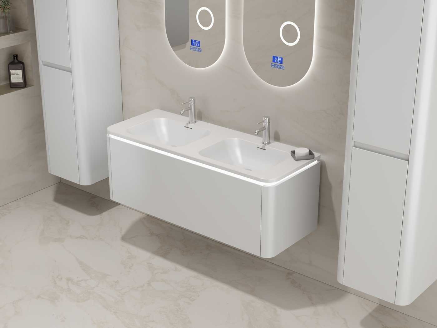 Type: BOSTON1202-WH. Afmetingen Complete set: 1 * Wastafelmeubel - 1200x455x400mm, 1 * Dubbele wasbak - 1205x460x190mm, 2 * Zijkast - 1500x350x350mm, 2* Spiegel- 450x900mm. Voorzien van: LED verlichting in onderkast - 2 kranen inclusief pop-up afvoer – 1 lade met 2 opbergvakken - Softclose lade systeem - LED spiegels met anti-fog systeem - Voorgemonteerde zijkasten en wastafelmeubel. Bezorgtermijn 14 dagen Merk: Vonato Model: Lumi 120 Product type: 2-Persoons 120 cm Hoogte: 40cm Lengte: 46cm Materiaal: Melamine, MDF, metaal Kleur: Wit Kraan: Inclusief 2 kranen Wastafel: Inclusief dubbele wastafel Waskom: 0 Spiegelkast: Nee Spiegel: Ja Spiegel met verlichting: Ja Verlichting: Ja Onderkast: Ja Lades: 1 Bevestigingsmateriaal: Ja