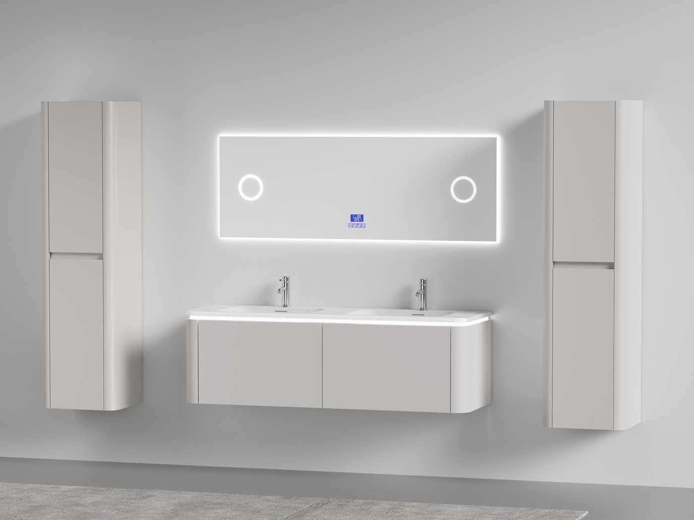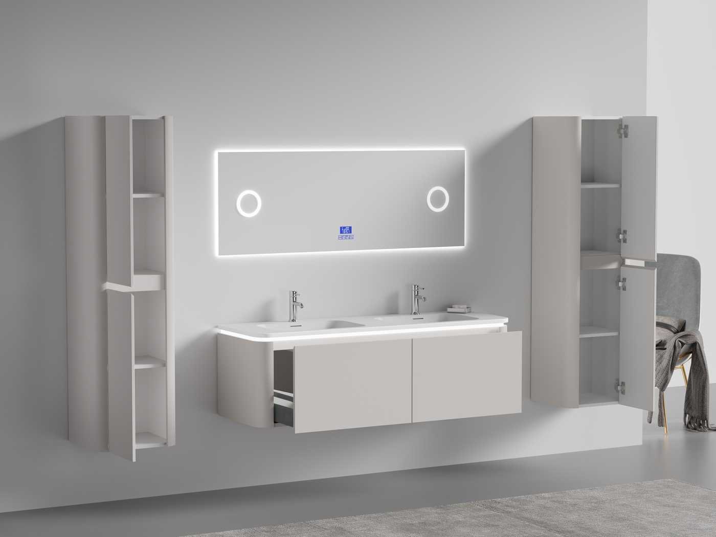 Type: BOSTON1401-TA. Afmetingen Complete set: 1 * Wastafelmeubel - 1400x455x400mm, 1 * Dubbele wasbak - 1405x460x190mm, 2 * Zijkast - 1500x350x350mm, 1 * Spiegel- 1400x600mm. Voorzien van: LED verlichting in onderkast - 2 kranen inclusief pop-up afvoer – 2 lades - Softclose lade systeem - LED spiegel met anti-fog systeem - Voorgemonteerde zijkasten en wastafelmeubel. Bezorgtermijn 14 dagen Merk: Vonato Model: Veyra 140 Product type: 2-Persoons 140 cm Hoogte: 40cm Lengte: 46cm Materiaal: Melamine, MDF, metaal Kleur: Taupe Kraan: Inclusief 2 kranen Wastafel: Inclusief dubbele wastafel Waskom: 0 Spiegelkast: Nee Spiegel: Ja Spiegel met verlichting: Ja Verlichting: Ja Onderkast: Ja Lades: 2 Bevestigingsmateriaal: Ja