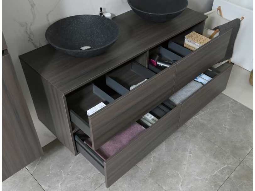 Type: 9010. Afmeting: 3-delige set: 1 * Wastafelmeubel - 1300x470x550mm, 1 * Zijkast - 1500x350x350mm, 1 * Spiegel- 1300x600mm. Voorzien van: Muurkranen inclusief pop-up afvoer – 4 stevige metalen lades - Softclose lade systeem – Stenen waskommen - LED spiegel - Voorgemonteerde zijkast en wastafelmeubel. Bezorgtermijn 14 dagen Merk: Vonato Model: Modena 130 Product type: 2-persoons 130 cm Hoogte: 55cm Lengte: 47cm Materiaal: Melamine, stenen waskommen Kleur: Donker hout decor Kraan: Inclusief 2 muurkranen Wastafel: 0 Waskom: 2 Spiegelkast: Nee Spiegel: Ja Spiegel met verlichting: Ja Verlichting: Ja Onderkast: Ja Lades: 4 Bevestigingsmateriaal: Ja