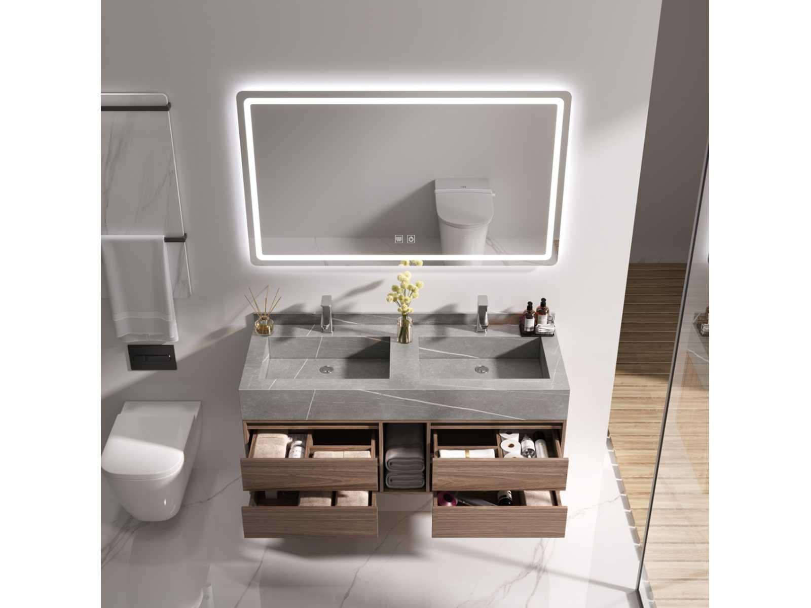Type: MBY-412. Afmeting: 2-persoons set: 1 * Wastafelmeubel - 1200x550x550mm, 1 * Spiegel - ca. 1200x700mm. Voorzien van: Softclose lade systeem: 4 lades - Kranen inclusief pop-up drain - Spiegel met touchscreen LED-verlichting en anti-fog technologie - Voorgemonteerd wastafelmeubel. Bezorgtermijn 14 dagen Merk: Vonato Model: Luxury 100 Product type: 2-Persoons 120 cm Hoogte: 55cm Lengte: 55cm Materiaal: Meubel: Multiplex met melamine, Wasbak: Marmer Kleur: Donker hout decor Kraan: Inclusief 2 kranen Wastafel: Inclusief dubbele wastafel Waskom: 0 Spiegelkast: Nee Spiegel: Ja Spiegel met verlichting: Ja Verlichting: Ja Onderkast: Ja Lades: 4 Bevestigingsmateriaal: Ja