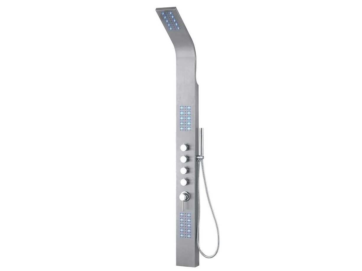 Type: ST903 Model: Geborsteld RVS Voorzien van: 3 * LED-verlichting in elk van de sproeierpanelen (24 stuks) - Regendouche voorzien van 24 afzonderlijke kleine sproeiers - 2 Massagepanelen elk met 24 massagesproeiers - Thermostatische mengkraan - Eenvoudige installatie door twee meegeleverde beugels en aansluitslangen. Bezorgtermijn 14 dagen Merk: Vonato Model: Solano Product type: Douchepaneel Regendouche Kleur: Zilverkleurig Lengte: 145cm Hoogte: 16cm Materiaal: RVS