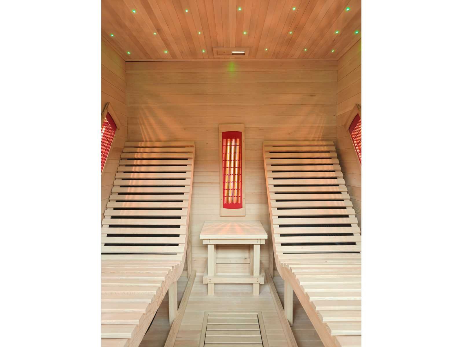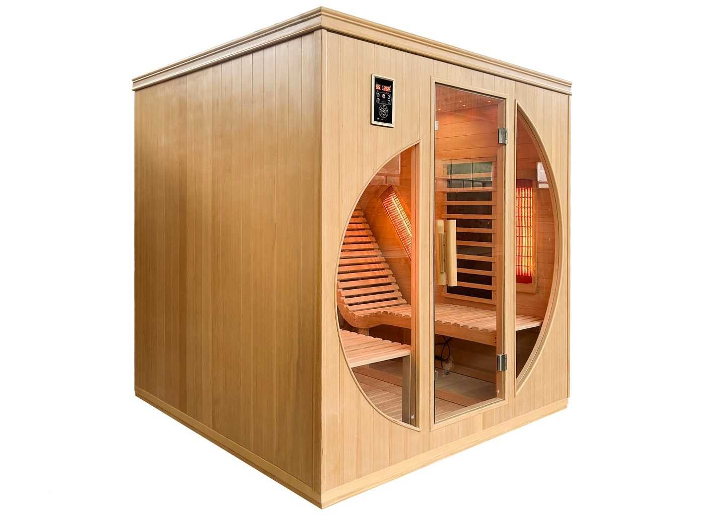 Type: SMI-B202. Model: Infraroodkachel - rechthoekig - Tweepersoons. Kachel: Infrarood 6 kW. Afmeting: 1800x1800x1900mm. Verwarming: Infraroodverwarming - Verwarmde giethars platen die evenredig warmte afgeven binnen de sauna. Voorzien van: Helder veiligheidsglas (8mm) - Ventilatierooster - Control Panel met USB aansluiting en Bluetooth - Speakers - 220V - Plafondverlichting - Houten deurhendel - 2 ligbedden Bezorgtermijn 14 dagen Merk: Vonato Model: Zalvina Product type: Rechthoekig Infrarood Kleur: Hout Lengte: 180cm Hoogte: 190cm Materiaal: Hout met helder veiligheidsglas