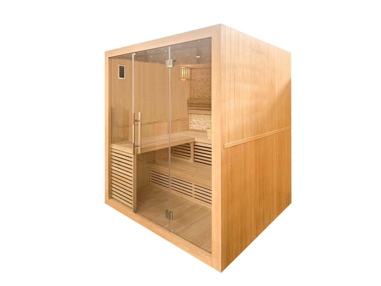 Type: SMS-L102N. Model: met Kachel - rechthoekig. Afmetingen: 2200x2200x2100mm. Verwarming: Kachel (6kW). Details: Sterrenhemel sfeerverlichting - Achterwanden zijn voorzien van lichte natuurstenen strips. Voorzien van: Isolatie - Helder veiligheidsglas (8mm) - Hittebestendige deurknoppen - Ca. 20 kg. Lavastenen - Ventilatierooster - Touchscreen Control Panel - Bluetooth integratie voor muziek met dubbele speaker (eenvoudig te bedienen via de Control Panel) - Comfortabele zitbank - Houten emmer met scheplepel - Zandloper - Thermometer - 220V Merk: Vonato Model: Terano Product type: Prisma met Kachel Kleur: Hout Lengte: 200cm Hoogte: 210cm Materiaal: Hout met helder veiligheidsglas