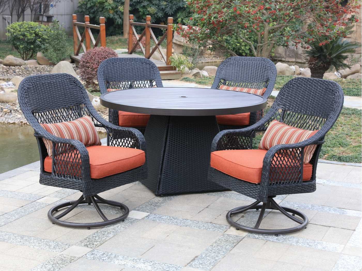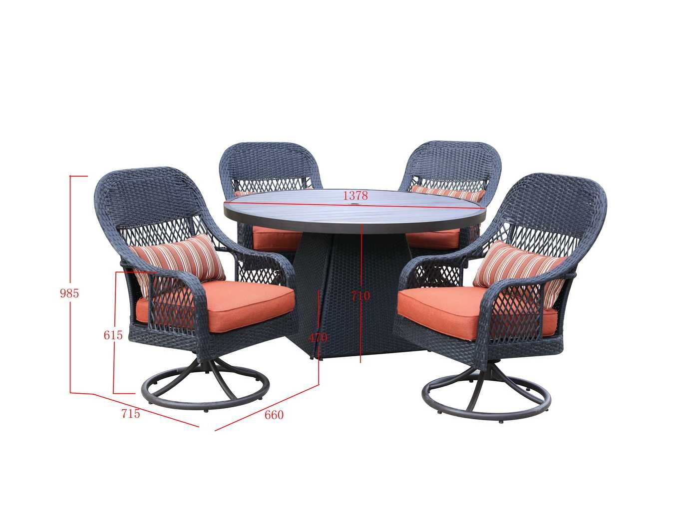 Type: REDONDA. Afmetingen: 5-delige set: 4 * Losse draaistoelen: 66x71x98 cm , 1 * Ronde eettafel: Ø138 cm, hoogte: 71 cm. Zithoogte: 47 cm. Voorzien van: Waterafstotende kussens - Weerbestendig vlechtwerk - Gat voor parasol - Draaibare stoelen Bezorgtermijn 14 dagen Merk: VONATO Model: Solaro Product type: 5-delig Kussens: Oranje Stapelbaar: Nee Verstelbaar: 0 Vorm: rond Stoelen: 4 Kleur: Antraciet Lengte: 0cm Hoogte: 71cm Materiaal: Gepoedercoat aluminium frame Diepte: 0 Zithoogte: 47