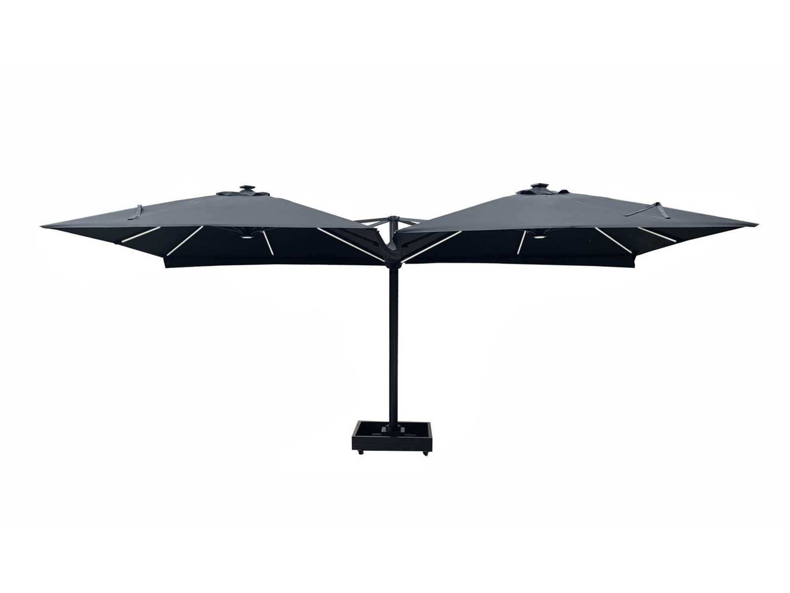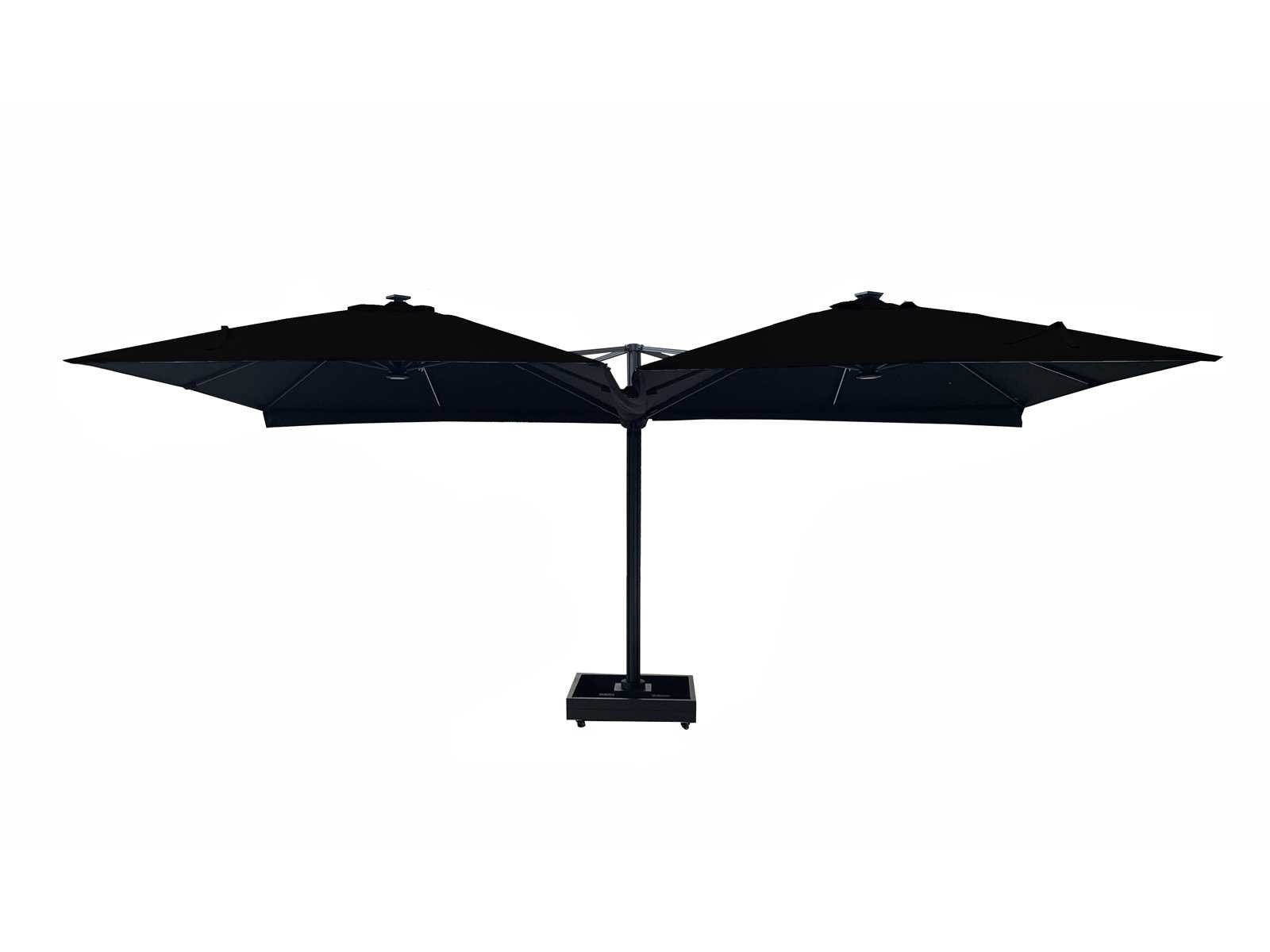 Type: U1075 QUATRE 3X3 BLACK. De parasol is ideaal voor gebruik in de horeca en/of op een groot terras, tuin of binnenplaats. De parasol bestaat uit 4 parasols aan een frame en is voorzien van een grondanker. Exclusief verrijdbare parasolvoet: deze is los verkrijgbaar. Voorzien van: LED-verlichting onder het doek zodat het 's avonds ook nog goed vertoeven is onder de parasol. - Groot parasoldoek, 4 stuks, met een afmeting van ø300 cm. - Sterk en stevig frame gemaakt van aluminium. - Eenvoudig startklaar te zetten voor gebruik. - Brandvertragend, dik doek voor een betere UV-bescherming. - Ventilatie aan de bovenzijde van het doek. - De parasols zijn voorzien van een afritsbaar tussenstuk om de parasols te verbinden. Bezorgtermijn 14 dagen Merk: Paralux Model: Bravira Product type: 0 Vorm: Vierkant Parasolvoet: Excl. parasolvoet; de parasol is voorzien van een grondanker Verstelbaar: 0 Kleur: Zwart Lengte: 300cm Hoogte: 320cm Materiaal: Aluminium frame, 200 grams brandvertragend doek